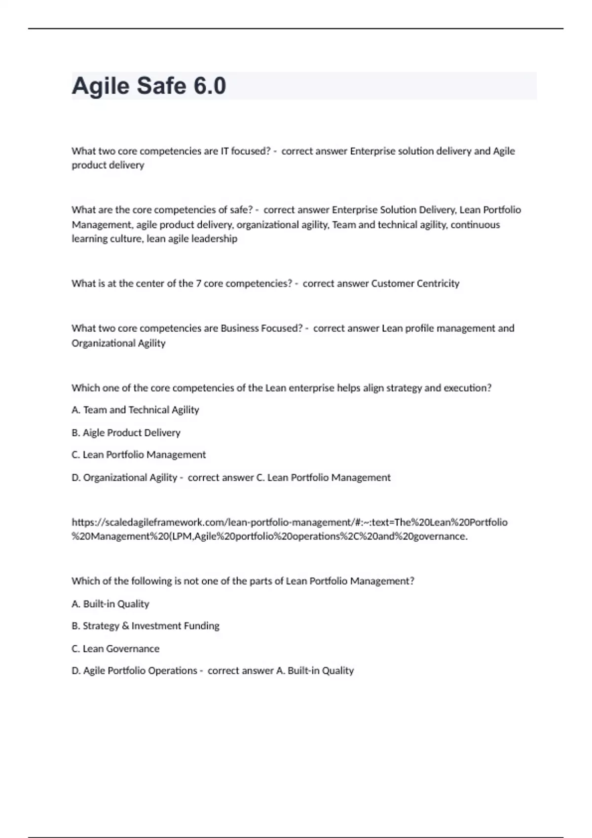 Agile Safe 6.0What two core competencies are IT focused? - correct answer Enterprise solution delivery and Agile product delivery What are the core competencies of safe? - correct answer Enterprise Solution Delivery, Lean Portfolio Management, agile product delivery, organizational agility, Team and technical agility, continuous learning culture, lean agile leadership What is at the center of the 7 core competencies? - correct answer Customer Centricity What two core competencies are Business Focused? - correct answer Lean profile management and Organizational Agility Which one of the core competencies of the Lean enterprise helps align strategy and execution? A. Team and Technical Agility B. Aigle Product Delivery C. Lean Portfolio Management D. Organizational Agility - correct answer C. Lean Portfolio Management Which of the following is not one of the parts of Lean Portfolio Management? A. Built-in Quality B. Strategy & Investment Funding C. Lean Governance D. Agile Portfolio Operations - correct answer A. Built-in Quality