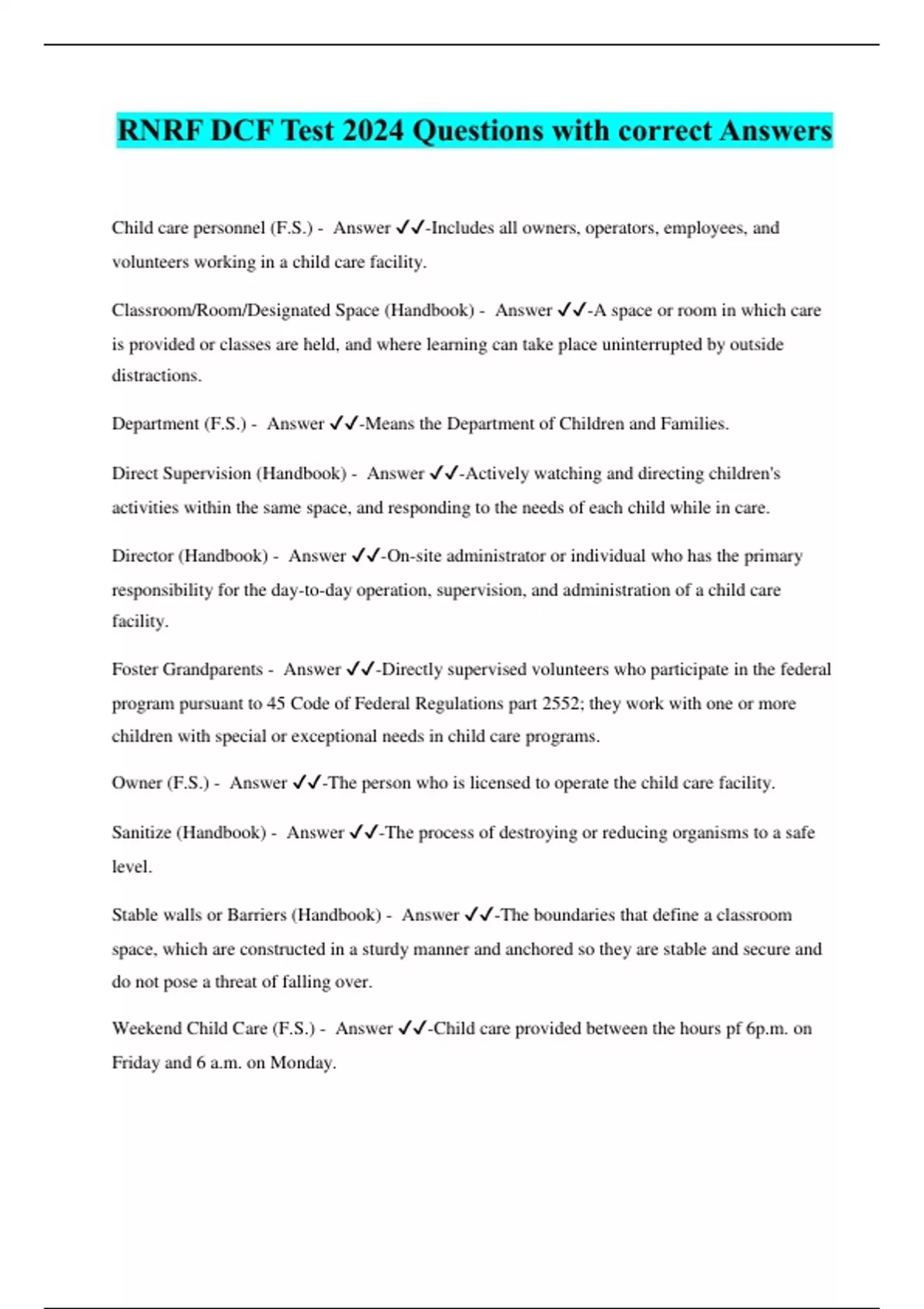 RNRF DCF Test 2024 Questions with correct Answers Child care personnel (F.S.) - Answer ️️ -Includes all owners, operators, employees, and volunteers working in a child care facility. Classroom/Room/Designated Space (Handbook) - Answer ️️ -A space or room in which care is provided or classes are held, and where learning can take place uninterrupted by outside distractions. Department (F.S.) - Answer ️️ -Means the Department of Children and Families. Direct Supervision (Handbook) - Answer ️️ -Actively watching and directing children's activities within the same space, and responding to the needs of each child while in care. Director (Handbook) - Answer ️️ -On-site administrator or individual who has the primary responsibility for the day-to-day operation, supervision, and administration of a child care facility. Foster Grandparents - Answer ️️ -Directly supervised volunteers who participate in the federal program pursuant to 45 Code of Federal Regulations part 2552; they work with one or more children with special or exceptional needs in child care programs. Owner (F.S.) - Answer ️️ -The person who is licensed to operate the child care facility. Sanitize (Handbook) - Answer ️️ -The process of destroying or reducing organisms to a safe level. Stable walls or Barriers (Handbook) - Answer ️️ -The boundaries that define a classroom space, which are constructed in a sturdy manner and anchored so they are stable and secure and do not pose a threat of falling over. Weekend Child Care (F.S.) - Answer ️️ -Child care provided between the hours pf 6p.m. on Friday and 6 a.m. on Monday