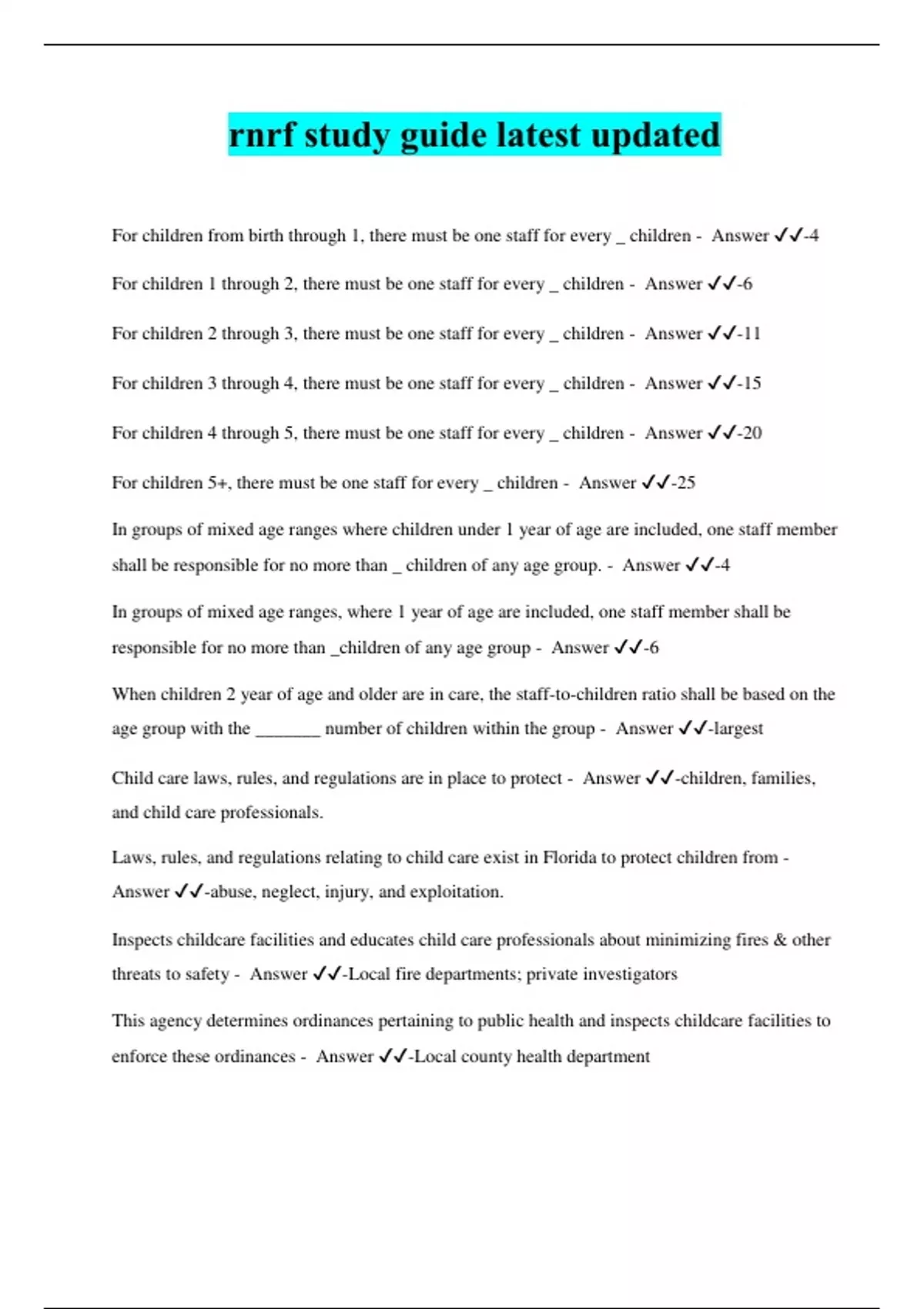 rnrf study guide latest updated For children from birth through 1, there must be one staff for every _ children - Answer ️️ -4 For children 1 through 2, there must be one staff for every _ children - Answer ️️ -6 For children 2 through 3, there must be one staff for every _ children - Answer ️️ -11 For children 3 through 4, there must be one staff for every _ children - Answer ️️ -15 For children 4 through 5, there must be one staff for every _ children - Answer ️️ -20 For children 5+, there must be one staff for every _ children - Answer ️️ -25 In groups of mixed age ranges where children under 1 year of age are included, one staff member shall be responsible for no more than _ children of any age group. - Answer ️️ -4 In groups of mixed age ranges, where 1 year of age are included, one staff member shall be responsible for no more than _children of any age group - Answer ️️ -6 When children 2 year of age and older are in care, the staff-to-children ratio shall be based on the age group with the _______ number of children within the group - Answer ️️ -largest Child care laws, rules, and regulations are in place to protect - Answer ️️ -children, families, and child care professionals. Laws, rules, and regulations relating to child care exist in Florida to protect children from - Answer ️️ -abuse, neglect, injury, and exploitation. Inspects childcare facilities and educates child care professionals about minimizing fires & other threats to safety - Answer ️️ -Local fire departments; private investigators This agency determines ordinances pertaining to public health and inspects childcare facilities to enforce these ordinances - Answer ️️ -Local county health department