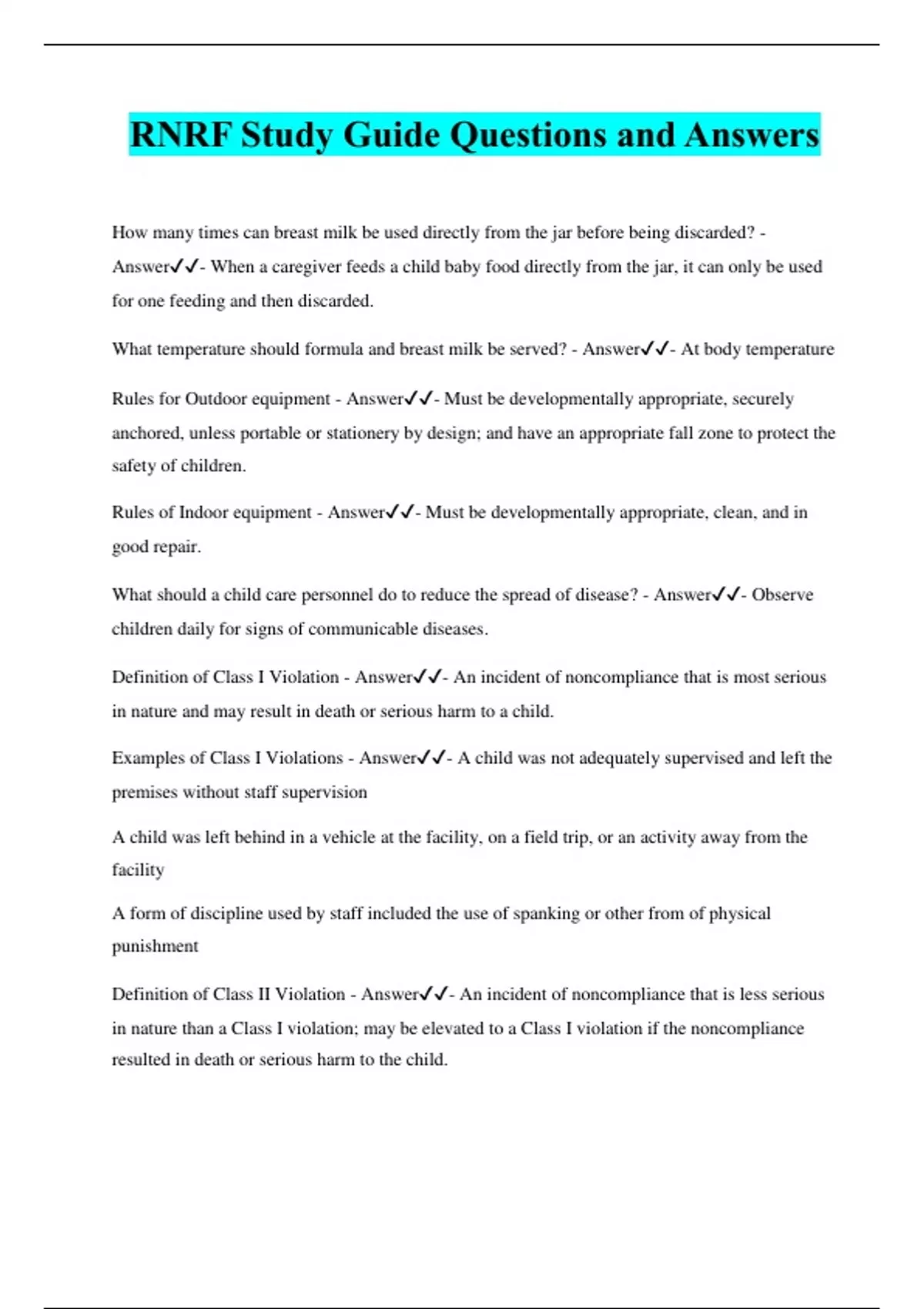 RNRF Study Guide Questions and Answers How many times can breast milk be used directly from the jar before being discarded? - Answer️️ - When a caregiver feeds a child baby food directly from the jar, it can only be used for one feeding and then discarded. What temperature should formula and breast milk be served? - Answer️️ - At body temperature Rules for Outdoor equipment - Answer️️ - Must be developmentally appropriate, securely anchored, unless portable or stationery by design; and have an appropriate fall zone to protect the safety of children. Rules of Indoor equipment - Answer️️ - Must be developmentally appropriate, clean, and in good repair. What should a child care personnel do to reduce the spread of disease? - Answer️️ - Observe children daily for signs of communicable diseases. Definition of Class I Violation - Answer️️ - An incident of noncompliance that is most serious in nature and may result in death or serious harm to a child. Examples of Class I Violations - Answer️️ - A child was not adequately supervised and left the premises without staff supervision A child was left behind in a vehicle at the facility, on a field trip, or an activity away from the facility A form of discipline used by staff included the use of spanking or other from of physical punishment Definition of Class II Violation - Answer️️ - An incident of noncompliance that is less serious in nature than a Class I violation; may be elevated to a Class I violation if the noncompliance resulted in death or serious harm to the child. Examples of Class II Violations - Answer️️ - The facility's outdoor play space was not enclosed with fencing or walls a minimum of 4 feet in height The bedding available was not sanitary and poses a threat to the health, safety, or well-being of a child in care The director responsible for the daily operation of the program did not have an active Director Credential Definition of Class III Violation - Answer️️ - An incident of noncompliance and is the least serious in nature. Examples of Class III Violations - Answer️️ - Documentation of pediatric cardiopulmonary resuscitation training was not on file for staff The facility's first aid kit was within reach of children The facility was notified of allergies to medication or special restrictions and there was no written documentation in the child's f