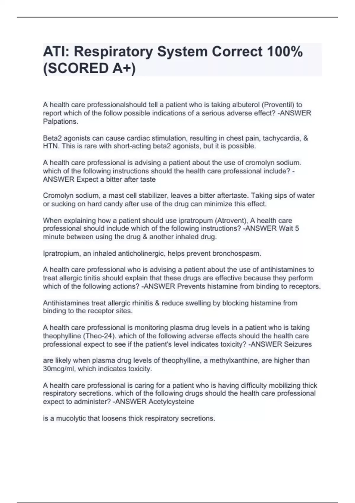 A health care professionalshould tell a patient who is taking albuterol (Proventil) to report which of the follow possible indications of a serious adverse effect? -ANSWER Palpations. Beta2 agonists can cause cardiac stimulation, resulting in chest pain, tachycardia, & HTN. This is rare with short-acting beta2 agonists, but it is possible. A health care professional is advising a patient about the use of cromolyn sodium. which of the following instructions should the health care professional include? -ANSWER Expect a bitter after taste Cromolyn sodium, a mast cell stabilizer, leaves a bitter aftertaste. Taking sips of water or sucking on hard candy after use of the drug can minimize this effect. When explaining how a patient should use ipratropum (Atrovent), A health care professional should include which of the following instructions? -ANSWER Wait 5 minute between using the drug & another inhaled drug. Ipratropium, an inhaled anticholinergic, helps prevent bronchospasm. A health care professional who is advising a patient about the use of antihistamines to treat allergic tinitis should explain that these drugs are effective because they perform which of the following actions? -ANSWER Prevents histamine from binding to receptors. Antihistamines treat allergic rhinitis & reduce swelling by blocking histamine from binding to the receptor sites. A health care professional is monitoring plasma drug levels in a patient who is taking theophylline (Theo-24). which of the following adverse effects should the health care professional expect to see if the patient's level indicates toxicity? -ANSWER Seizures are likely when plasma drug levels of theophylline, a methylxanthine, are higher than 30mcg/ml, which indicates toxicity. A health care professional is caring for a patient who is having difficulty mobilizing thick respiratory secretions. which of the following drugs should the health care professional expect to administer? -ANSWER Acetylcysteine is a mucoly