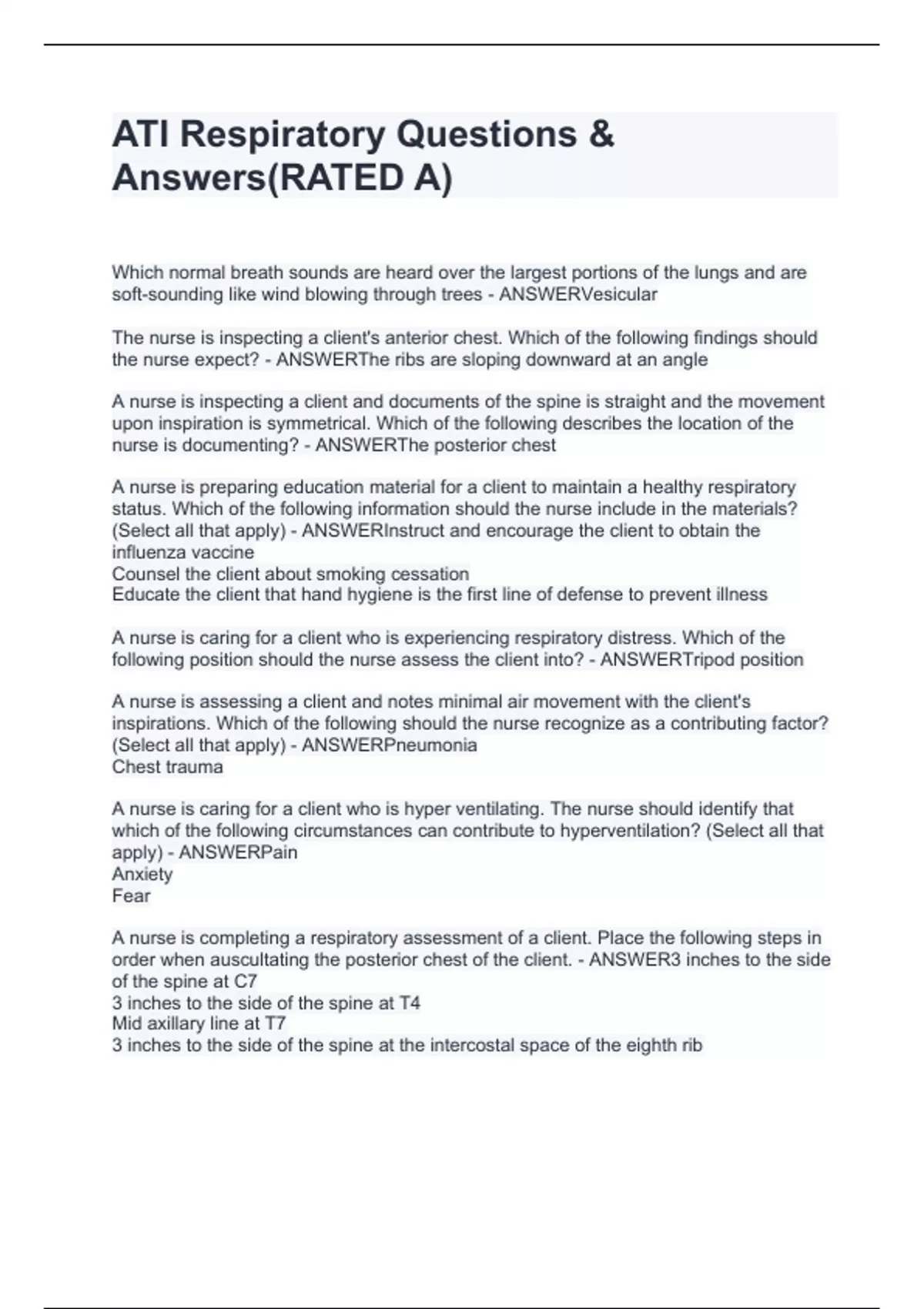 ATI Respiratory Questions & Answers(RATED A)