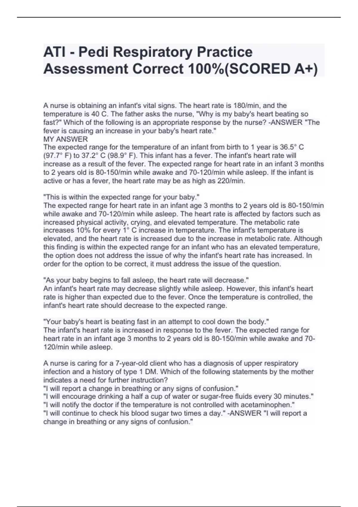 A nurse is obtaining an infant's vital signs. The heart rate is 180/min, and the temperature is 40 C. The father asks the nurse, "Why is my baby's heart beating so fast?" Which of the following is an appropriate response by the nurse? -ANSWER "The fever is causing an increase in your baby's heart rate." MY ANSWER The expected range for the temperature of an infant from birth to 1 year is 36.5° C (97.7° F) to 37.2° C (98.9° F). This infant has a fever. The infant's heart rate will increase as a result of the fever. The expected range for heart rate in an infant 3 months to 2 years old is 80-150/min while awake and 70-120/min while asleep. If the infant is active or has a fever, the heart rate may be as high as 220/min. "This is within the expected range for your baby." The expected range for heart rate in an infant age 3 months to 2 years old is 80-150/min while awake and 70-120/min while asleep. The heart rate is affected by factors such as increased physical activity, crying, and elevated temperature. The metabolic rate increases 10% for every 1° C increase in temperature. The infant's temperature is elevated, and the heart rate is increased due to the increase in metabolic rate. Although this finding is within the expected range for an infant who has an elevated temperature, the option does not address the issue of why the infant's heart rate has increased. In order for the option to be correct, it must address the issue of the question. "As your baby begins to fall asleep, the heart rate will decrease." An infant's heart rate may decrease slightly while asleep. However, this infant's heart rate is higher than expected due to the fever. Once the temperature is controlled, the infant's heart rate should decrease to the expected range. "Your baby's heart is beating fast in an attempt to cool down the body." The infant's heart rate is increased in response to the fever. The expected range for heart rate in an infant age 3 months to 2 years old is 80-150/min while awake and 70-120/min while asleep. A nurse is caring for a 7-year-old client who has a diagnosis of upper respiratory infection and a history of type 1 DM. Which of the following statements by the mother indicates a need for further instruction? "I will report a change in breathing or any signs of confusion." "I will encourage drinking a half a cup of water or sugar-free fluids every 30 minutes." "I will notify the doctor if the temperature is not controlled with acetaminophen." "I will continue to check his blood sugar two times a day." -ANSWER "I will report a change