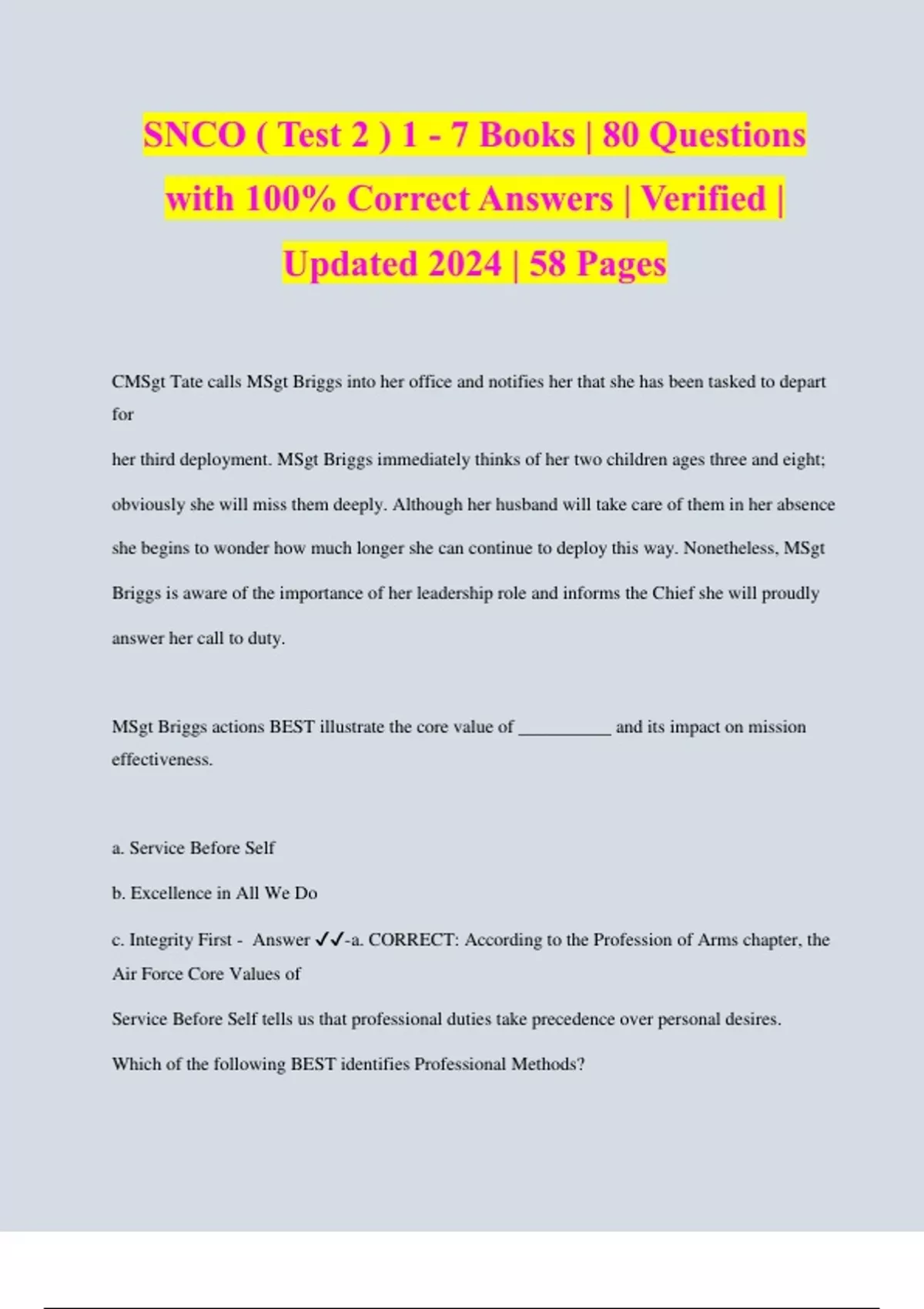 SNCO ( Test 2 ) 1 - 7 Books | 80 Questions with 100% Correct Answers | Verified | Updated 2024 | 58 Pages CMSgt Tate calls MSgt Briggs into her office and notifies her that she has been tasked to depart for her third deployment. MSgt Briggs immediately thinks of her two children ages three and eight; obviously she will miss them deeply. Although her husband will take care of them in her absence she begins to wonder how much longer she can continue to deploy this way. Nonetheless, MSgt Briggs is aware of the importance of her leadership role and informs the Chief she will proudly answer her call to duty. MSgt Briggs actions BEST illustrate the core value of __________ and its impact on mission effectiveness. a. Service Before Self b. Excellence in All We Do c. Integrity First - Answer ️️ -a. CORRECT: According to the Profession of Arms chapter, the Air Force Core Values of Service Before Self tells us that professional duties take precedence over personal desires. Which of the following BEST identifies Professional Methods? Professional Methods... a. involve the actual application of professional knowledge and theory b. encompass a combination of emotional, moral, and intellectual qualities c. include both tangible and intangible measurements of performance - Answer ️️ -a. CORRECT: According to the Profession of Arms chapter, professional methods involve the actual application of professional knowledge and theory to any given situation. MSgt Smith is two classes shy of completing his Community College of the Air Force Degree. Uncertain about his future in the Air Force he decides to make completion a priority for the upcoming year. He also decides to seek out other opportunities that will help increase his management skills. Looking back he wishes he would have been motived to do so earlier in his career. MSgt Smith actions BEST illustrate ___________. a. Developing Others b. Self-Development c. Direction, Discipline and Recognition - Answer ️️ -b. CORRECT: According to the Profession of Arms chapter, self-development is the disciplined will to leverage learning opportunities that increase or improve your knowledge, skills and attitudes. 5. A1C Rico has really been working hard over the last quarter. In fact, he has come to work early to complete assignments which helped the unit mission success rate stay above average. A1C Rico's efforts haven't gone unnoticed. To keep him motivated and hoping to increase the initiative of other unit members, MSgt Smith submits A1C Rico for Airman of the Quarter. MSgt Smith's actions BEST illustrate his understanding of ________ and its impact on subordinate effectiveness. a. Self-Development b. Developing Others c. Direction, Discipline and Recognition - Answer ️️ -c. CORRECT: According to the Profession of Arms chapter, DDR is critical to your early development and helps maintain a high degree of professionalism throughout your career. 6. SSgt Blount, a heavy equipment trainer, will be separating from the Air Force in six months. He's very excited about getting out and starting a new career. MSgt Kersey calls SSgt Blount into his office and informs him that he'll continue to train the new arrivals until his separation date. Upset SSgt Blount says, "This is unfair and will take up too much of my time." Because SSgt Blount ___________, his actions will MOST likely __________ mission effectiveness. a. understands Professional Methods; enhance b. misunderstands Professional Methods; hinder c. understands Professional Standards; enhance d. misunderstands Professional Standards; hinder - Answer ️️ -d. CORRECT: SSgt Blount's comments, "This is unfair and will take up too much of my time" reflect a professional standard values conflict. According to the Profession of Arms chapter, a values conflict occurs when personal values conflict with those of the institution. 7. MSgt Smith is overseeing newly assigned members of his unit performing routine vehicle checks. Through observation, he notices that some of the members are not conducting the checks as required. Although his Airmen are working, MSgt Smith can tell they're not sure as to what they should be doing. He decides he needs to conduct on-the-job training to bring his members up to speed. Because MSgt Smith _____________, his actions will MOST likely ____________ mission effectiveness. a. understands DDR; enhance b. misunderstands DDR; hinder c. understands Professional Methods; enhance - Answer ️️ -a. CORRECT: MSgt Smith decision to conduct on-the-job training represents his understanding of DDR. Direction is critical to early development and helps you learn your job. Total Force Fitness a. A holistic approach to developing overarching Airman fitness and resilience. b. The ability to withstand, recover an