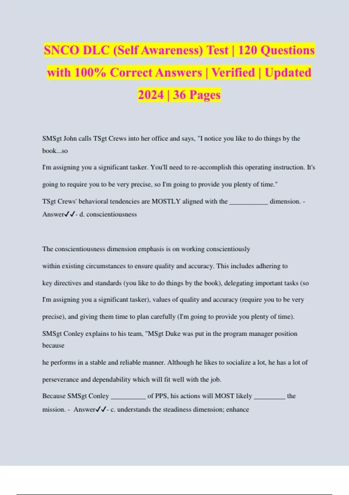 SNCO DLC (Self Awareness) Test | 120 Questions with 100% Correct Answers | Verified | Updated 2024 | 36 Pages SMSgt John calls TSgt Crews into her office and says, "I notice you like to do things by the book...so I'm assigning you a significant tasker. You'll need to re-accomplish this operating instruction. It's going to require you to be very precise, so I'm going to provide you plenty of time." TSgt Crews' behavioral tendencies are MOSTLY aligned with the ___________ dimension. - Answer️️ - d. conscientiousness The conscientiousness dimension emphasis is on working conscientiously within existing circumstances to ensure quality and accuracy. This includes adhering to key directives and standards (you like to do things by the book), delegating important tasks (so I'm assigning you a significant tasker), values of quality and accuracy (require you to be very precise), and giving them time to plan carefully (I'm going to provide you plenty of time). SMSgt Conley explains to his team, "MSgt Duke was put in the program manager position because he performs in a stable and reliable manner. Although he likes to socialize a lot, he has a lot of perseverance and dependability which will fit well with the job. Because SMSgt Conley __________ of PPS, his actions will MOST likely _________ the mission. - Answer️️ - c. understands the steadiness dimension; enhance The steadiness dimension emphasis is on cooperating with others within existing circumstances to carry out the task. This includes being consistent (stable), predictable (reliable), patience (perseverance), and loyalty (dependability). Although the influence dimension includes contacting people (socializing a lot), there's more evidence of the steadiness dimension in the scenario and the position calls for steadiness. Understanding this will enhance the mission. SMSgt Wilson calls TSgt Tilley into his office and says, "I have a tasker that requires you to communicate with every individual in the unit. We need to show the positive impact of these new procedures. You might have to tutor and advise some of our new folks on the new process and I know you like that kind of stuff, so I'm going to give you this one." TSgt Tilley's behavioral tendencies are MOSTLY aligned with the ___________ dimension. - Answer️️ - b. influence The influence dimension emphasis is on shaping the environment by influencing or persuading others. This includes contacting people (communicate with every individual in the unit), making a favorable impression (show a positive impact), and coaching and counseling (tutor and advise). SMSgt Todd remembers her PPS lesson in the SNCOA distance learning course. She calls TSgt Smith into her office and says, "I noticed you are the type of person that likes to move fast on stuff at work. I have a project that requires you to take the lead and give me a hurried turnaround on it. It may also require you to manage some of the concerns of others. Smith replies, "I do like to be in charge of things...when can I start?" The next day, Todd notices Smith directing several aspects of the project without any supervision. SMSgt Todd's actions BEST illustrate her understanding that TSgt Smith is mostly in the______ dimension of PPS. - Answer️️ - a. dominance