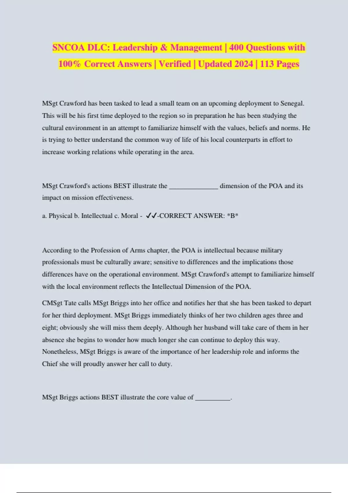 SNCOA DLC: Leadership & Management | 400 Questions with 100% Correct Answers | Verified | Updated 2024 | 113 Pages MSgt Crawford has been tasked to lead a small team on an upcoming deployment to Senegal. This will be his first time deployed to the region so in preparation he has been studying the cultural environment in an attempt to familiarize himself with the values, beliefs and norms. He is trying to better understand the common way of life of his local counterparts in effort to increase working relations while operating in the area. MSgt Crawford's actions BEST illustrate the ______________ dimension of the POA and its impact on mission effectiveness. a. Physical b. Intellectual c. Moral -️️ -CORRECT ANSWER: *B* According to the Profession of Arms chapter, the POA is intellectual because military professionals must be culturally aware; sensitive to differences and the implications those differences have on the operational environment. MSgt Crawford's attempt to familiarize himself with the local environment reflects the Intellectual Dimension of the POA. CMSgt Tate calls MSgt Briggs into her office and notifies her that she has been tasked to depart for her third deployment. MSgt Briggs immediately thinks of her two children ages three and eight; obviously she will miss them deeply. Although her husband will take care of them in her absence she begins to wonder how much longer she can continue to deploy this way. Nonetheless, MSgt Briggs is aware of the importance of her leadership role and informs the Chief she will proudly answer her call to duty. MSgt Briggs actions BEST illustrate the core value of __________. a. Service Before Self b. Excellence in All We Do c. Integrity First -️️ -CORRECT ANSWER: *A* According to the Profession of Arms chapter, the Air Force Core Values of Service Before Self tells us that professional duties take precedence over personal desires. Which of the following BEST identifies Professional Methods? Professional Methods... a. involve the actual application of professional knowledge and theory b. encompass a combination of emotional, moral, and intellectual qualities c. include both tangible and intangible measurements of performance -️️ -CORRECT ANSWER: *A* According to the Profession of Arms chapter, professional methods involve the actual application of professional knowledge and theory to any given situation. Professional Methods include: -️️ -Technical Knowledge Communication Leadership and Management skills Professional Character includes: -️️ -Attitude Alignment with core values Alignment with AFI 36-2618 Professional Standards include: -️️ -Quality and quantity of work Ethical behavior Professional relationships Adherence to and promotion of core values Adherence to and promotion of AFI 36-2618 MSgt Smith is two classes shy of completing his Community College of the Air Force Degree. Uncertain about his future in the Air Force he decides to make completion a priority for the upcoming year. He also decides to seek out other opportunities that will help increase his management skills. Looking back he wishes he would have been motived to do so earlier in his career. MSgt Smith actions BEST illustrate ___________. a. Developing Others b. Self-Development c. Direction, Discipline and Recognition -️️ -CORRECT ANSWER: *B* b. CORRECT: According to the Profession of Arms chapter, self-development is the disciplined will to leverage learning opportunities that increase or improve your knowledge, skills and attitudes. A1C Rico has really been working hard over the last quarter. In fact, he has come to work early to complete assignments which helped the unit mission success rate stay above average. A1C Rico's efforts haven't gone unnoticed. To keep him motivated and hoping to increase the initiative of other unit members, MSgt Smith submits A1C Rico for Airman of the Quarter. MSgt Smith's actions BEST illustrate his understanding of ________ and its impact on subordinate effectiveness. a. Self-Development b. Developing Others c. Direction, Discipline and Recognition -️️ -CORRECT ANSWER: *C* According to the Profession of Arms chapter, DDR is critical to your early development and helps maintain a high degree of professionalism throughout your career. SSgt Blount, a heavy equipment trainer, will be separating from the Air Force in six months. He's very excited about getting out and starting a new career. MSgt Kersey calls SSgt Blount into his office and informs him that he'll continue to train the new arrivals until his separation date. Upset SSgt Blount says, "This is unfair and will take up too much of my time." Because SSgt Blount ___________, his actions will MOST likely __________ mission effectiveness. a. understands Professional Methods; enhance b. misunderstands Professional Methods; hinder c. understands Professional Standards; enhance d. misunderstands Professional Standards; hinder -️️ -CORRECT ANSWER: *D