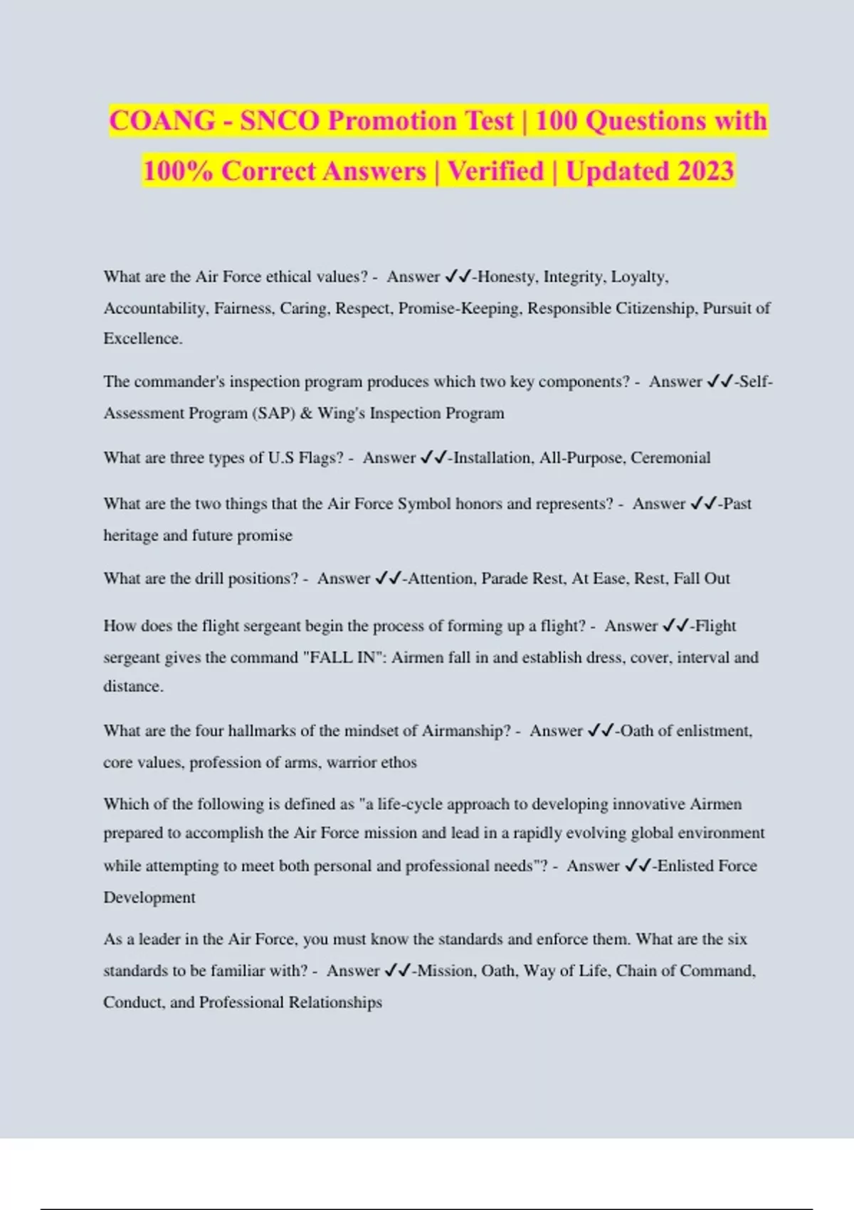 COANG - SNCO Promotion Test | 100 Questions with 100% Correct Answers | Verified | Updated 2023 What are the Air Force ethical values? - Answer ️️ -Honesty, Integrity, Loyalty, Accountability, Fairness, Caring, Respect, Promise-Keeping, Responsible Citizenship, Pursuit of Excellence. The commander's inspection program produces which two key components? - Answer ️️ -Self- Assessment Program (SAP) & Wing's Inspection Program What are three types of U.S Flags? - Answer ️️ -Installation, All-Purpose, Ceremonial What are the two things that the Air Force Symbol honors and represents? - Answer ️️ -Past heritage and future promise What are the drill positions? - Answer ️️ -Attention, Parade Rest, At Ease, Rest, Fall Out How does the flight sergeant begin the process of forming up a flight? - Answer ️️ -Flight sergeant gives the command "FALL IN": Airmen fall in and establish dress, cover, interval and distance. What are the four hallmarks of the mindset of Airmanship? - Answer ️️ -Oath of enlistment, core values, profession of arms, warrior ethos Which of the following is defined as "a life-cycle approach to developing innovative Airmen prepared to accomplish the Air Force mission and lead in a rapidly evolving global environment while attempting to meet both personal and professional needs"? - Answer ️️ -Enlisted Force Development As a leader in the Air Force, you must know the standards and enforce them. What are the six standards to be familiar with? - Answer ️️ -Mission, Oath, Way of Life, Chain of Command, Conduct, and Professional Relationships What are the 5 qualities that leaders must demonstrate to be effective counselors? - Answer ️️ - Respect for Airman, Self-Awareness, Cultural Awareness, Empathy, Credibility What is the definition of Organizational Climate? - Answer ️️ -The way in which members in a unit perceive and characterize their unit environment. Support and logic are the tools used to build __________ and __________with your audience? - Answer ️️ -Credibility, Trust What are the four domains of Comprehensive Airmen Fitness that must be understood and mastered? - Answer ️️ -Social, Physical, Mental, Spiritual What are methods leaders can employ to reduce and manage resistance to change? - Answer ️️ -Education and Communication; Participation and Involvement; Facilitation and Support; Negotiation and Agreement; Coercion What are the five styles of conflict management? - Answer ️️ -Competing (or Forcing); Collaborating; Accommodating; Avoiding; Compromising What core value is defined as the "moral compass"? - Answer ️️ -Integrity When filing a complaint with the Inspector General, what form is used when an Air Force member wants to identify a fraud, waste and abuse complaint at the highest level? - Answer ️️ -Air Force Form 102 What are the 3 levels Air Force Leadership? - Answer ️️ -Tactical, Operational, Strategic A SNCO translates Leadership's directions into what? - Answer ️️ -Executable tasks and responsibilities for their teams What are the four hallmarks of the Airmanship mindset? - Answer ️️ -Oath of enlistment, USAF core values, profession of arms, warrior ethos ________________ is a life-cycle approach to developing innovative Airmen prepared to accomplish the Air Force mission and lead in a rapid