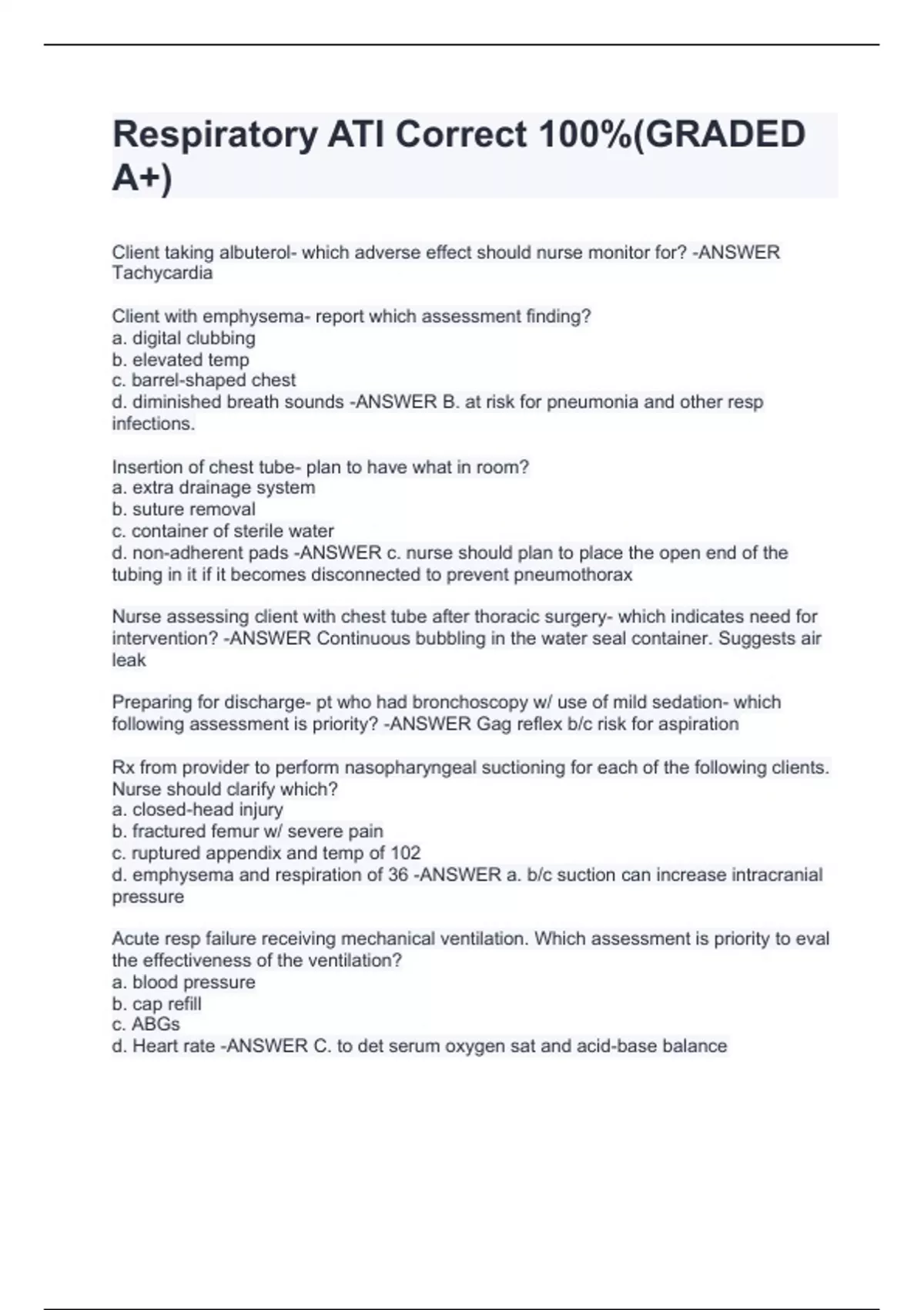 Client taking albuterol- which adverse effect should nurse monitor for? -ANSWER Tachycardia Client with emphysema- report which assessment finding? a. digital clubbing b. elevated temp c. barrel-shaped chest d. diminished breath sounds -ANSWER B. at risk for pneumonia and other resp infections. Insertion of chest tube- plan to have what in room? a. extra drainage system b. suture removal c. container of sterile water d. non-adherent pads -ANSWER c. nurse should plan to place the open end of the tubing in it if it becomes disconnected to prevent pneumothorax Nurse assessing client with chest tube after thoracic surgery- which indicates need for intervention? -ANSWER Continuous bubbling in the water seal container. Suggests air leak Preparing for discharge- pt who had bronchoscopy w/ use of mild sedation- which following assessment is priority? -ANSWER Gag reflex b/c risk for aspiration Rx from provider to perform nasopharyngeal suctioning for each of the following clients. Nurse should clarify which? a. closed-head injury b. fractured femur w/ severe pain c. ruptured appendix and temp of 102 d. emphysema and respiration of 36 -ANSWER a. b/c suction can increase intracranial pressure Acute resp failure receiving mechanical ventilation. Which assessment is priority to eval the effectiveness of the ventilation? a. blood pressure b. cap refill c. ABGs d. Heart rate -ANSWER C. to det serum oxygen sat and acid-base balance