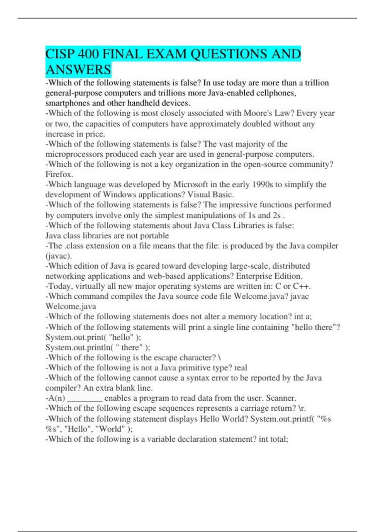 CISP 400 FINAL EXAM QUESTIONS AND ANSWERS -Which of the following statements is false? In use today are more than a trillion general-purpose computers and trillions more Java-enabled cellphones, smartphones and other handheld devices. -Which of the following is most closely associated with Moore's Law? Every year or two, the capacities of computers have approximately doubled without any increase in price. -Which of the following statements is false? The vast majority of the microprocessors produced each year are used in general-purpose computers. -Which of the following is not a key organization in the open-source community? Firefox. -Which language was developed by Microsoft in the early 1990s to simplify the development of Windows applications? Visual Basic. -Which of the following statements is false? The impressive functions performed by computers involve only the simplest manipulations of 1s and 2s . -Which of the following statements about Java Class Libraries is false: Java class libraries are not portable -The .class extension on a file means that the file: is produced by the Java compiler (javac). -Which edition of Java is geared toward developing large-scale, distributed networking applications and web-based applications? Enterprise Edition. -Today, virtually all new major operating systems are written in: C or C++. -Which command compiles the Java source code file W? javac W -Which of the following statements does not alter a memory location? int a; -Which of the following statements will print a single line containing "hello there"? S( "hello" ); Sln( " there" ); -Which of the following is the escape character? -Which of the following is not a Java primitive type? real -Which of the following cannot cause a syntax error to be reported by the Java compiler? An extra blank line. -A(n) ________ enables a program to read data from the user. Scanner. -Which of the following escape sequences represents a carriage return? r. -Which of the following statement displays Hello World? Sf( "%s %s", "Hello", "World" ); -Which of the following is a variable declaration statement? int total; -Which of the following statements is true? Compilers translate high-level language programs into machine language programs. -Which of the following data items are arranged from the smallest to the largest in the data hierarchy. bits, characters, fields, records, files. -Which software product release category is "generally feature complete and supposedly bug free, and ready for use by the community?" Release candidate. - Which statement is false? A class is an instance of its object. -________ is a graphical language that allows people who design software systems to use an industry standard notation to represent them. The Unified Modeling Language -Which of the following languages is used primarily for scientific and engineering applications? Fortran. -Which of the following companies is widely regarded at the "signature" company of Web 2.0 ? Google. -Which of the following statements is false? Information in the memory unit is persistent—it is retained when the computer's power is turned off. -_______ models software in terms similar to those that people use to describe real-world objects. Object-oriented design -The command ________ executes a Java application. java -Which of the following is not a compilation error? Placing a semicolon at the end of the first line of an if statement. -Which of the following does not contain a syntax error? Sln( "Hello world!" ); -The format specifier ________ is a placeholder for an int value? %d -Which of the following is not a valid Java identifier? my Value -What will be output after the following Java statements have been executed? int a, b, c, d; a = 4; b = 12; c = 37; d = 51; if ( a < b ) Sln( "a < b" ); if ( a > b ) Sln( "a > b" ); if ( d <= c ) Sln( "d <= c" ); if ( c != d ) Sln( "c != d" ); A: a < b c != d -All import declarations must be placed. before the class declaration. -Which of the following is not an arithmetic operator? . -Which command executes the Java class file W? java Welcome -End-of-line comments that should be ignored by the compiler are denoted using. Two forward slashes ( // ). -What is the value of result after the following Java statements execute? int a, b, c, d, result; a = 4; b = 12; c = 37; d = 51; result = d % a * c + a % b + a; A: 119 -Java was originally developed for: Intelligent consumer devices. - ________ helps Internet-based applications perform like desktop applications. Ajax -Which of the following statements is false? Windows is an open source operating system. -Which of the following is not one of the three general types of computer languages? Spoken languages. -Which of the following is not one of the six logical units of a computer? Printer. -_______ involves reworking programs to make them clearer and easier to maintain while preserving their correctness and functionality. Refactoring -Which language was developed by Microsoft in the early 1990s to simplify the development of Windows applications? Visual Basic. -The command ________ executes a Java application. java -The .class extension on a file means that the file: is produced by the Java compiler (javac). -Today, virtually all new major operating systems are written in: C or C++. -When method printf requires multiple arguments, the arguments are separated with ________. commas (,). -Which of the following statements would display the phase Java is fun? Sln( "hellois funrJava " ); -Which is the output of the following statements? S( "Hello "); Sln( "World" ); A: Hello World -Each of the following is a relational or equality operator except: =! -Which of the following escape sequences represents a carriage return? r. -Which of the following cannot cause a syntax error to be reported by the Java compiler? An extra blank line. -How many significant digits does a double variable have? 15. -What is the difference between a float and a double? double variables store num