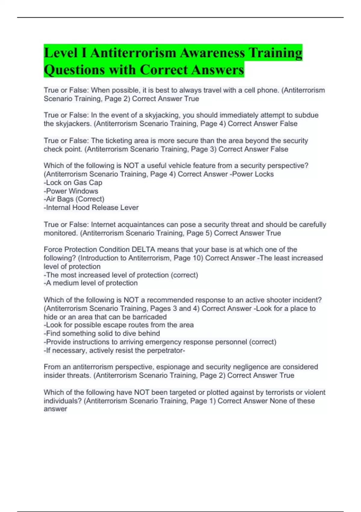 True or False: When possible, it is best to always travel with a cell phone. (Antiterrorism Scenario Training, Page 2) Correct Answer True True or False: In the event of a skyjacking, you should immediately attempt to subdue the skyjackers. (Antiterrorism Scenario Training, Page 4) Correct Answer False True or False: The ticketing area is more secure than the area beyond the security check point. (Antiterrorism Scenario Training, Page 3) Correct Answer False Which of the following is NOT a useful vehicle feature from a security perspective? (Antiterrorism Scenario Training, Page 4) Correct Answer -Power Locks -Lock on Gas Cap -Power Windows -Air Bags (Correct) -Internal Hood Release Lever True or False: Internet acquaintances can pose a security threat and should be carefully monitored. (Antiterrorism Scenario Training, Page 5) Correct Answer True Force Protection Condition DELTA means that your base is at which one of the following? (Introduction to Antiterrorism, Page 10) Correct Answer -The least increased level of protection -The most increased level of protection (correct) -A medium level of protection Which of the following is NOT a recommended response to an active shooter incident? (Antiterrorism Scenario Training, Pages 3 and 4) Correct Answer -Look for a place to hide or an area that can be barricaded -Look for possible escape routes from the area -Find something solid to dive behind -Provide instructions to arriving emergency response personnel (correct) -If necessary, actively resist the perpetrator- From an antiterrorism perspective, espionage and security negligence are considered insider threats. (Antiterrorism Scenario Training, Page 2) Correct Answer True Which of the following have NOT been targeted or plotted against by terrorists or violent individuals? (Antiterrorism Scenario Training, Page 1) Correct Answer None of these answer