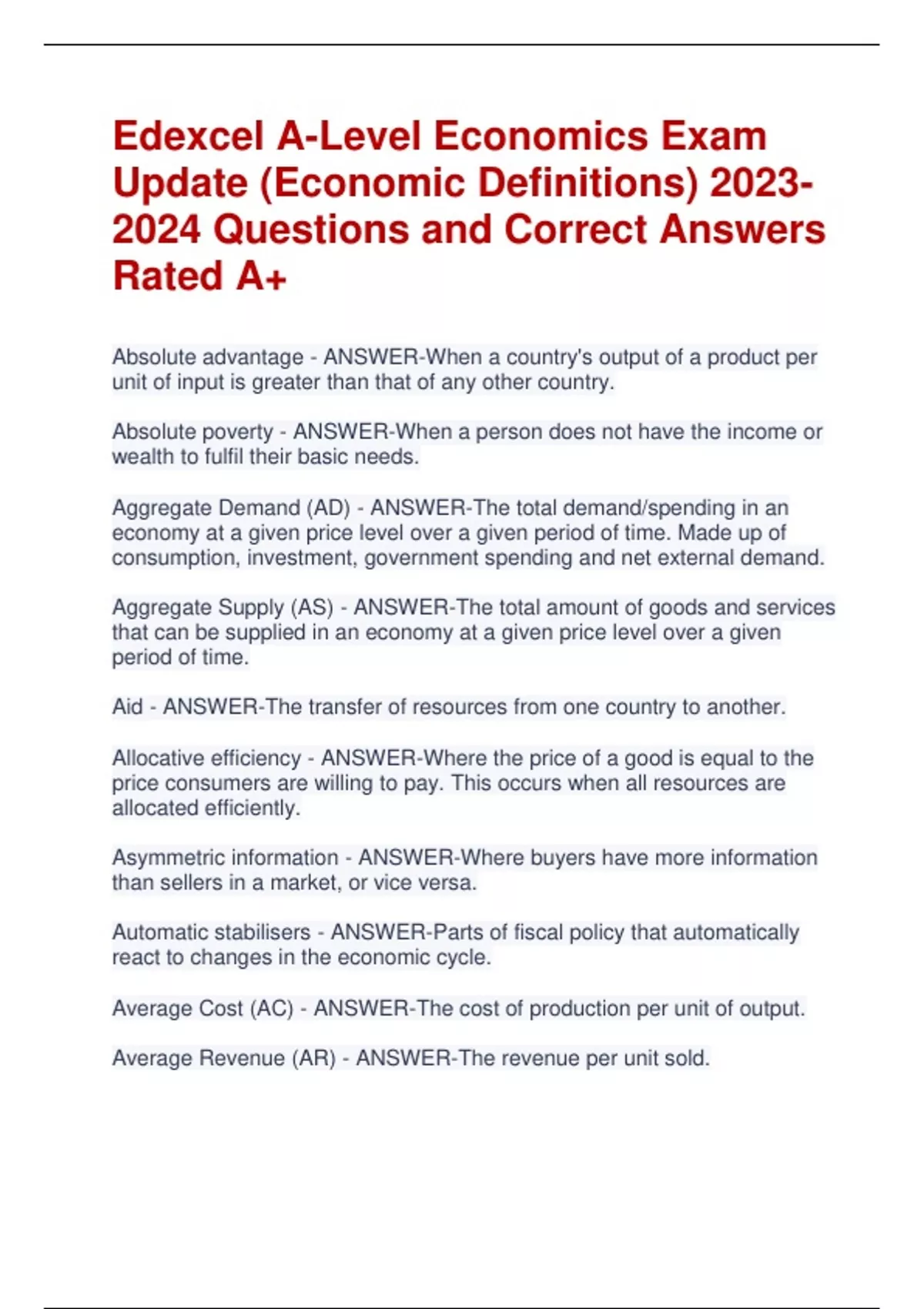 Edexcel A-Level Economics Exam Update (Economic Definitions) 2023- 2024 Questions and Correct Answers Rated A+