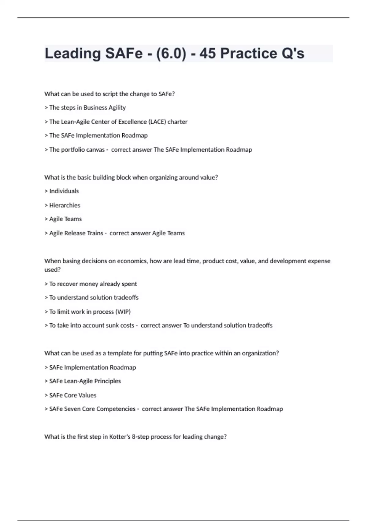 Leading SAFe - (6.0) - 45 Practice Q's What can be used to script the change to SAFe? > The steps in Business Agility > The Lean-Agile Center of Excellence (LACE) charter > The SAFe Implementation Roadmap > The portfolio canvas - correct answer The SAFe Implementation Roadmap What is the basic building block when organizing around value? > Individuals > Hierarchies > Agile Teams > Agile Release Trains - correct answer Agile Teams When basing decisions on economics, how are lead time, product cost, value, and development expense used? > To recover money already spent > To understand solution tradeoffs > To limit work in process (WIP) > To take into account sunk costs - correct answer To understand solution tradeoffs What can be used as a template for putting SAFe into practice within an organization? > SAFe Implementation Roadmap > SAFe Lean-Agile Principles > SAFe Core Values > SAFe Seven Core Competencies - correct answer The SAFe Implementation Roadmap What is the first step in Kotter's 8-step process for leading change?