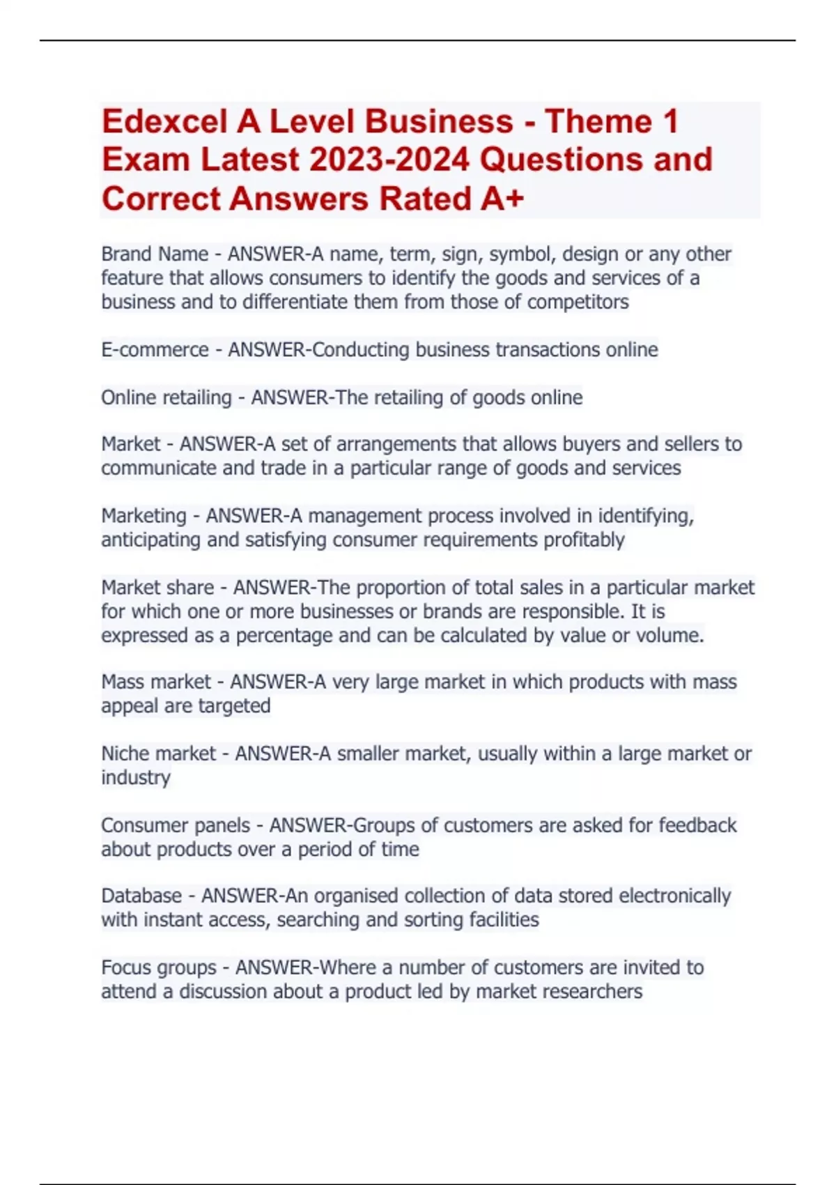 edexcel A Level Business - Theme 1 Exam Latest Questions and Correct Answers Rated A+