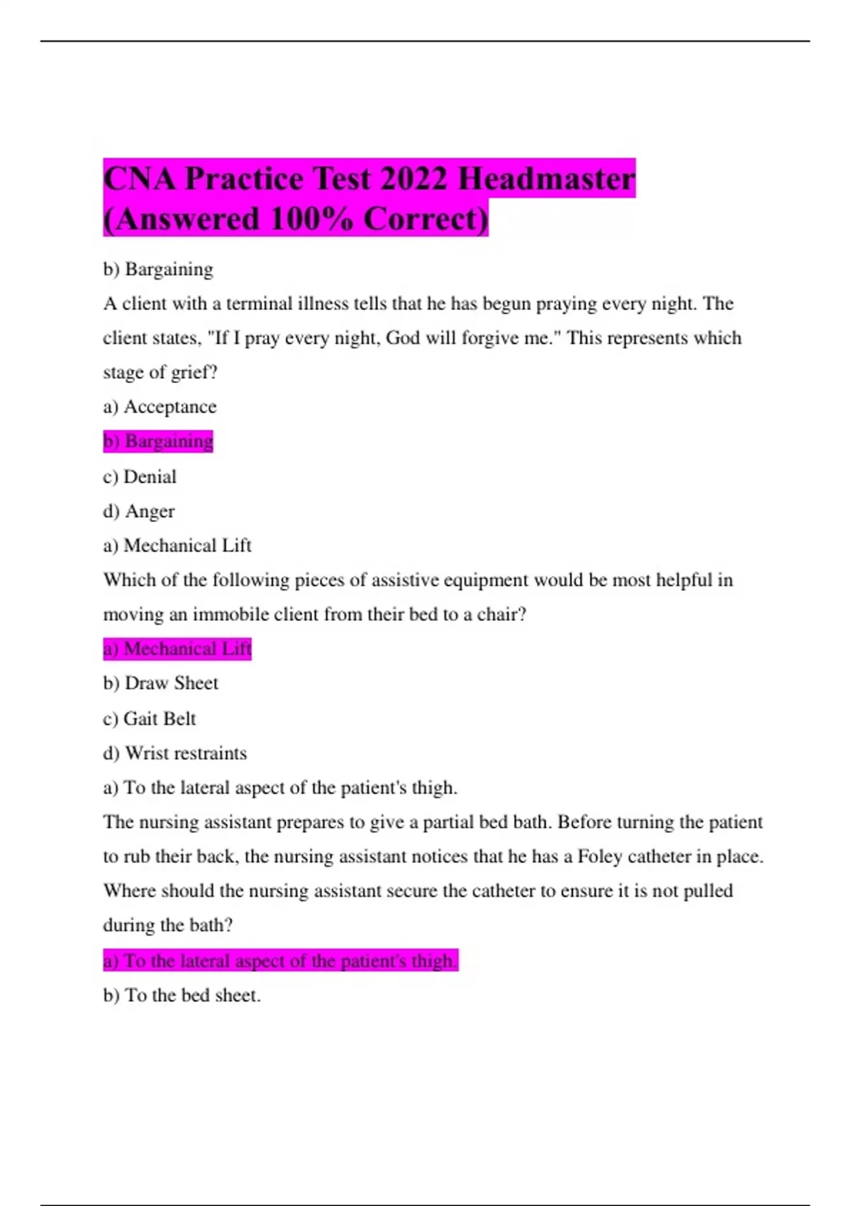 CNA Practice Test 2022 Headmaster (Answered 100% Correct) b) Bargaining A client with a terminal illness tells that he has begun praying every night. The client states, "If I pray every night, God will forgive me." This represents which stage of grief? a) Acceptance b) Bargaining c) Denial d) Anger a) Mechanical Lift Which of the following pieces of assistive equipment would be most helpful in moving an immobile client from their bed to a chair? a) Mechanical Lift b) Draw Sheet c) Gait Belt d) Wrist restraints a) To the lateral aspect of the patient's thigh. The nursing assistant prepares to give a partial bed bath. Before turning the patient to rub their back, the nursing assistant notices that he has a Foley catheter in place. Where should the nursing assistant secure the catheter to ensure it is not pulled during the bath? a) To the lateral aspect of the patient's thigh. b) To the bed sheet. c) To the medial aspect of the patient's thigh. d) To the bed. b) "I understand you're in pain. I'll stay with you." A patient has just received news about the death of his spouse. He states to the nursing assistant, "I can't believe this has happened to me. I don't know what to do. How can I live without my wife?" The nursing assistant best responds by stating: a) "You will need more time to cope with this loss." b) "I understand you're in pain. I'll stay with you." c) "This kind of thing will happen to everyone eventually." d) "Do you and your wife have any children together?" a) Allow the patient to perform as much of the bath as possible. The nursing assistant helps a patient who recently had a right-sided stroke to bathe. Which of the following describes the BEST method to support the patient's independence? a) Allow the patient to perform as much of the bath as possible. b) Ask the patient what he wants to do. c) Complete the entire bath for him to conserve his energy. d) Encourage the patient to do the best he can to clean himself. b) Partial thickness burn. A resident comes out of their room saying they have burn their leg after they dropped hot soup on it. The skin looks blistered and red. The nurse assistant knows this is a:
