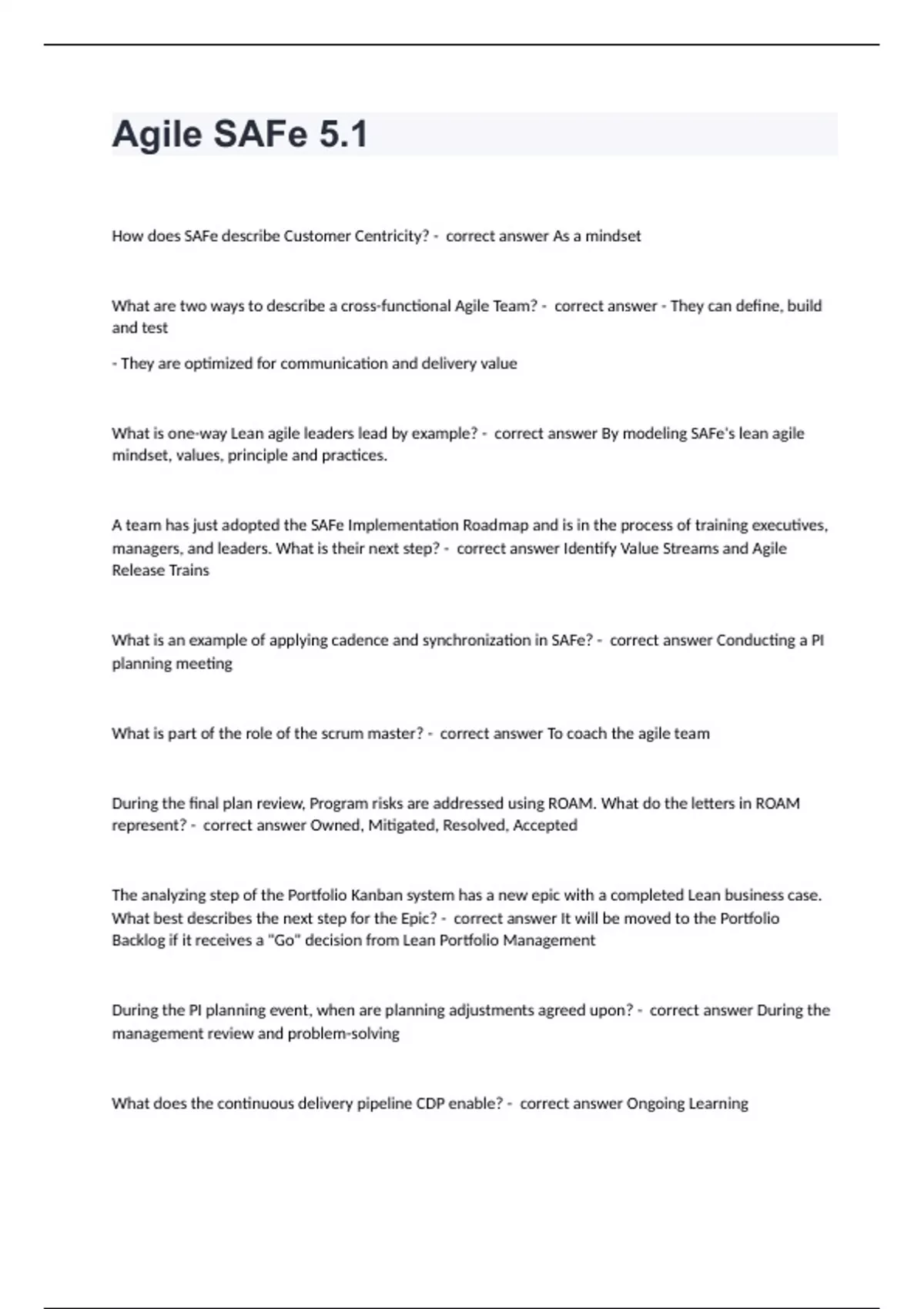 Agile SAFe 5.1How does SAFe describe Customer Centricity? - correct answer As a mindset What are two ways to describe a cross-functional Agile Team? - correct answer - They can define, build and test - They are optimized for communication and delivery value What is one-way Lean agile leaders lead by example? - correct answer By modeling SAFe's lean agile mindset, values, principle and practices. A team has just adopted the SAFe Implementation Roadmap and is in the process of training executives, managers, and leaders. What is their next step? - correct answer Identify Value Streams and Agile Release Trains What is an example of applying cadence and synchronization in SAFe? - correct answer Conducting a PI planning meeting What is part of the role of the scrum master? - correct answer To coach the agile team During the final plan review, Program risks are addressed using ROAM. What do the letters in ROAM represent? - correct answer Owned, Mitigated, Resolved, Accepted The analyzing step of the Portfolio Kanban system has a new epic with a completed Lean business case. What best describes the next step for the Epic? - correct answer It will be moved to the Portfolio Backlog if it receives a "Go" decision from Lean Portfolio Management During the PI planning event, when are planning adjustments agreed upon? - correct answer During the management review and problem-solving What does the continuous delivery pipeline CDP enable? - correct answer Ongoing Learning