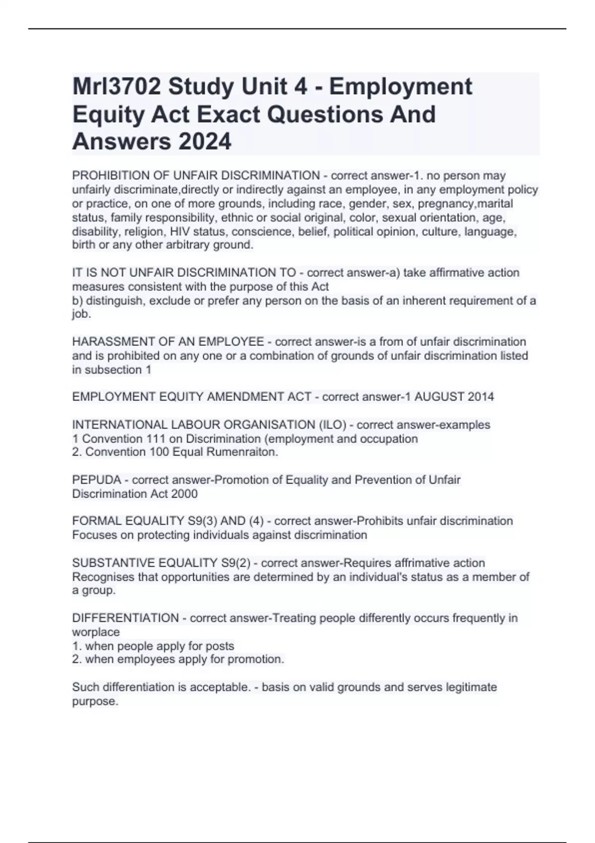 Mrl3702 Study Unit 4 - Employment Equity Act Exact Questions And Answers 2024
