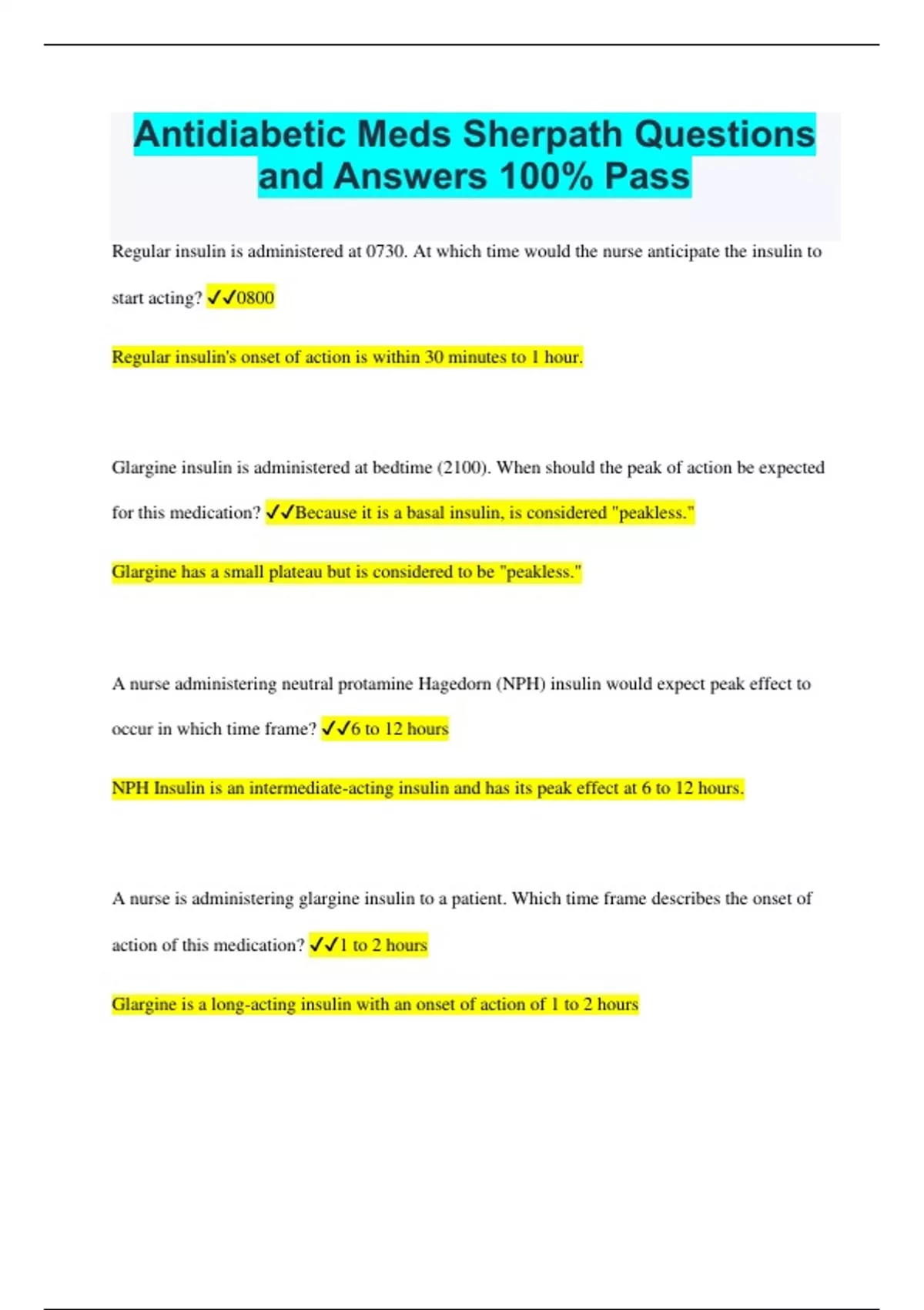 Antidiabetic Meds Sherpath Questions and Answers 100% Pass Regular insulin is administered at 0730. At which time would the nurse anticipate the insulin to start acting? 0800 Regular insulin's onset of action is within 30 minutes to 1 hour. Glargine insulin is administered at bedtime (2100). When should the peak of action be expected for this medication? Because it is a basal insulin, is considered "peakless." Glargine has a small plateau but is considered to be "peakless." A nurse administering neutral protamine Hagedorn (NPH) insulin would expect peak effect to occur in which time frame? 6 to 12 hours NPH Insulin is an intermediate-acting insulin and has its peak effect at 6 to 12 hours. A nurse is administering glargine insulin to a patient. Which time frame describes the onset of action of this medication? 1 to 2 hours Glargine is a long-acting insulin with an onset of action of 1 to 2 hours After taking metformin at 0800, in which time frame should the patient expect to take another dose? Within 24 hours Metformin's duration of action is 24 hours, allowing for one daily dosage. Which phrase describes the unique action of empagliflozin, an SGLT2 inhibitor used for type II diabetes? Promotes glucose excretion through the urine SGLT2 inhibitors like empagliflozin help to eliminate glucose in the urine. Which action of sulfonylurea drugs lowers the elevated blood glucose levels in patient with type II diabetes? Stimulates release of insulin from pancreas Sulfonylureas act primarily on the release of insulin from the pancreas, which lowers blood glucose levels. A nurse is treating an unconscious adult who is covered in sweat. The person has a history of diabetes. A blood glucose of 20 mg/dL is obtained. Which substance would the nurse administer? Glucagon injection Glucagon should be administered to patients who are unconscious or unable to swallow. A patient with type 1 diabetes has a scheduled dose of insulin due. Which action would the nurse take when the fingerstick glucose monitor reads 50 mg/dL? Hold scheduled dose and give fruit juice. Blood glucose should be 70 mg/dL or above. If a patient with a blood glucose of less than 60 mg/dL receives insulin, the blood glucose will decrease more. Holding the scheduled dose and giving juice would be the appropriate intervention. There is a clinical protocol to hold metformin for 48 hours before and after tests that require intravenous contrast dye. Which statement explains why metformin would be held? Contrast dye can cause kidney dysfunction, which is a metformin contraindication. Intravenous contrast dye that contains iodine has the potential to cause acute kidney disease. Because metformin is contraindicated in patients with renal dysfunction, it should be discontinued a day or two prior to the procedure and resumed 48 hours after the procedure, once lab results show normal renal function. A patient diagnosed with type 2 diabetes states, "I did not eat breakfast, but I made sure to take my repaglinide." Which response by the nurse is appropriate? "Skipping meals can cause your blood glucose to drop." Repaglinide regulates blood glucose, which could drop if the drug is taken without a meal