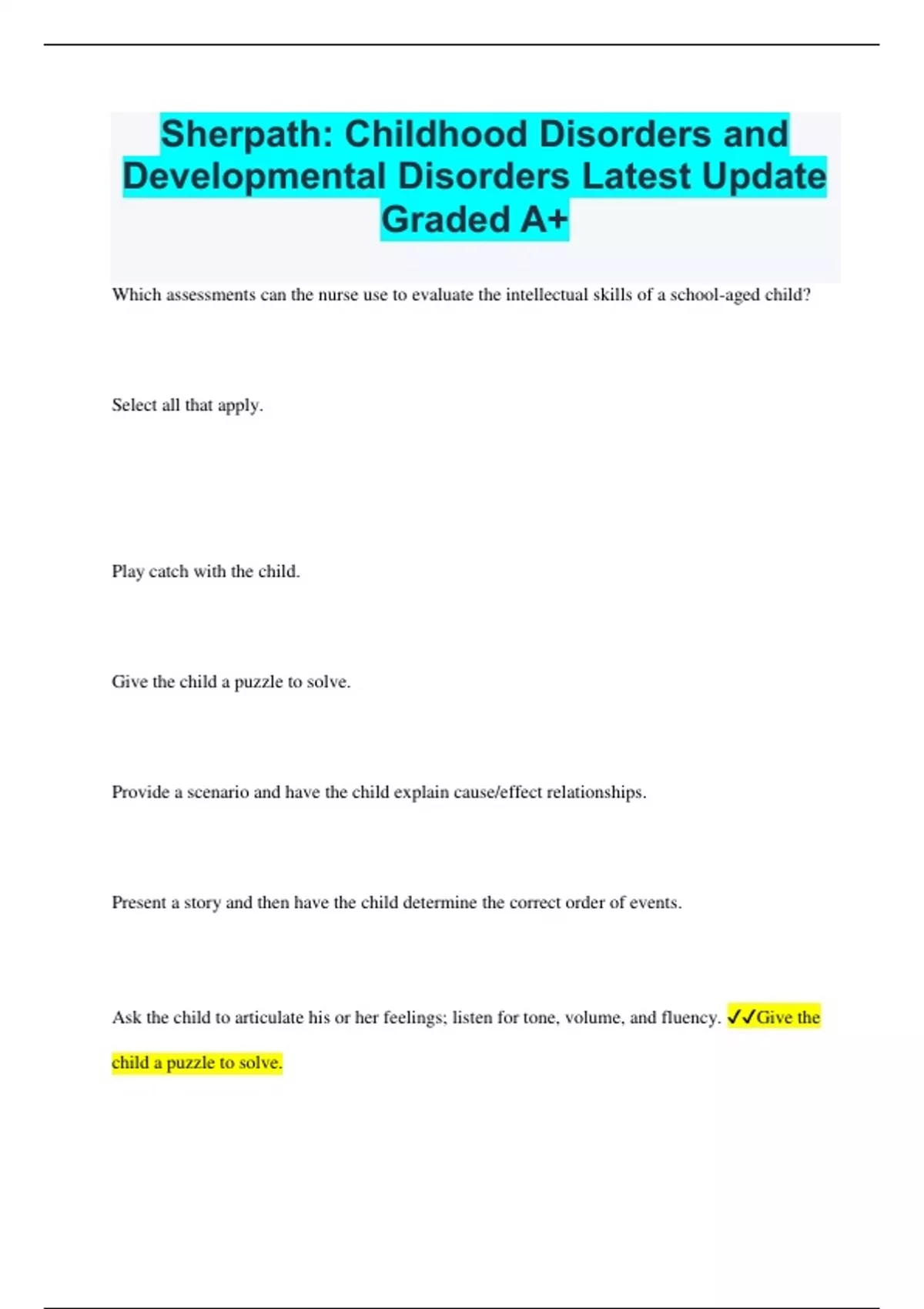 Sherpath: Childhood Disorders and Developmental Disorders Latest Update Graded A+ Which assessments can the nurse use to evaluate the intellectual skills of a school-aged child? Select all that apply. Play catch with the child. Give the child a puzzle to solve. Provide a scenario and have the child explain cause/effect relationships. Present a story and then have the child determine the correct order of events. Ask the child to articulate his or her feelings; listen for tone, volume, and fluency. Give the child a puzzle to solve. Use puzzles to determine the child's ability to solve problems and evaluate intellectual skills. Provide a scenario and have the child explain cause/effect relationships. Explaining cause/effect relationships allows for the evaluation of intellectual skills. The level of ability to solve problems can help determine the mental age of the child. Present a story and then have the child determine the correct order of events. Ordering events can allow the child to demonstrate understanding of sequence, and the nurse can evaluate intellectual skills. Which considerations are necessary when assessing a child for childhood disorders? Select all that apply. Inconsistent responses are expected. Child's first response is most accurate. Children typically provide predictable answers. Assessments must be repeated to determine a child's baseline developmental level. A wide range of cognitive ability should be expected as a result of variations in brain development. Inconsistent responses are expected. A child's responses may be inconsistent upon repetitive assessment. Children may not fully understand a question or may say what they think the interviewer would like to hear. Assessments must be repeated to determine a child's baseline developmental level. Repetitive assessment can help the nurse