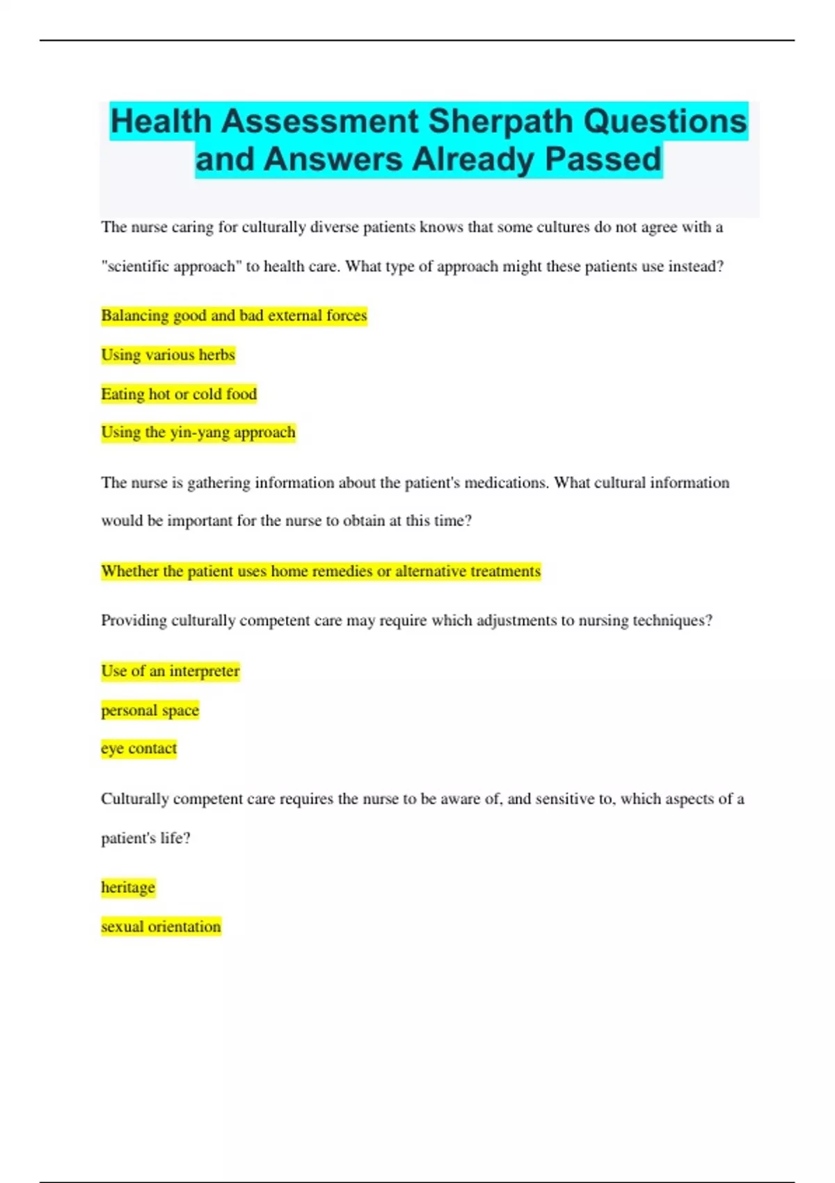 Health Assessment Sherpath Questions and Answers Already Passed The nurse caring for culturally diverse patients knows that some cultures do not agree with a "scientific approach" to health care. What type of approach might these patients use instead? Balancing good and bad external forces Using various herbs Eating hot or cold food Using the yin-yang approach The nurse is gathering information about the patient's medications. What cultural information would be important for the nurse to obtain at this time? Whether the patient uses home remedies or alternative treatments Providing culturally competent care may require which adjustments to nursing techniques? Use of an interpreter personal space eye contact Culturally competent care requires the nurse to be aware of, and sensitive to, which aspects of a patient's life? heritage sexual orientation Socioeconomic status ethnicity Which special circumstances should the nurse inquire about when assessing patients of ethnic minorities? Stressors and support networks Sense of life control Patient literacy The nurse is interviewing a non-English-speaking patient. What should the nurse do to best facilitate communication during the assessment? Use an interpreter When preparing a dietary meal plan for a new patient, the nurse understands that which cultural factors may play a role in the patient's food selection? Food beliefs Periods of required fasting Culturally forbidden foods Which aspects of a patient's life that are influenced by culture may have an impact on patient care? Health beliefs and practices Dietary practices Treatment preferences communication The nurse is caring for a patient from an unfamiliar culture who states the intent to use an alternative therapy to treat a health condition. What is the nurse's best response? "What type of alternative treatment do you plan to use?" Use of a medical interpreter to take a patient history in a non-English-speaking patient is preferred over use of the patient's family member(s) for which reasons? The ability of the interpreter to provide culturally sensitive advice The interpreter's knowledge of medical terminology The interpreter's understanding of patient rights The tendency for a patient to withhold embarrassing or private information from family When interviewing a patient through use of an interpreter, how should the nurse adjust the interviewing process? Knowledge of whether the patient belongs to a religious organization A spiritual group may be a resource during or after an illness, and knowledge of this can help the nurse identify the patient's faith-based influences. The nurse is conducting a cultural assessment of a patient from an unfamiliar culture. What information would be helpful in establishing the patient's faith-based influences and rituals? eye contact What is the nurse's goal in employing