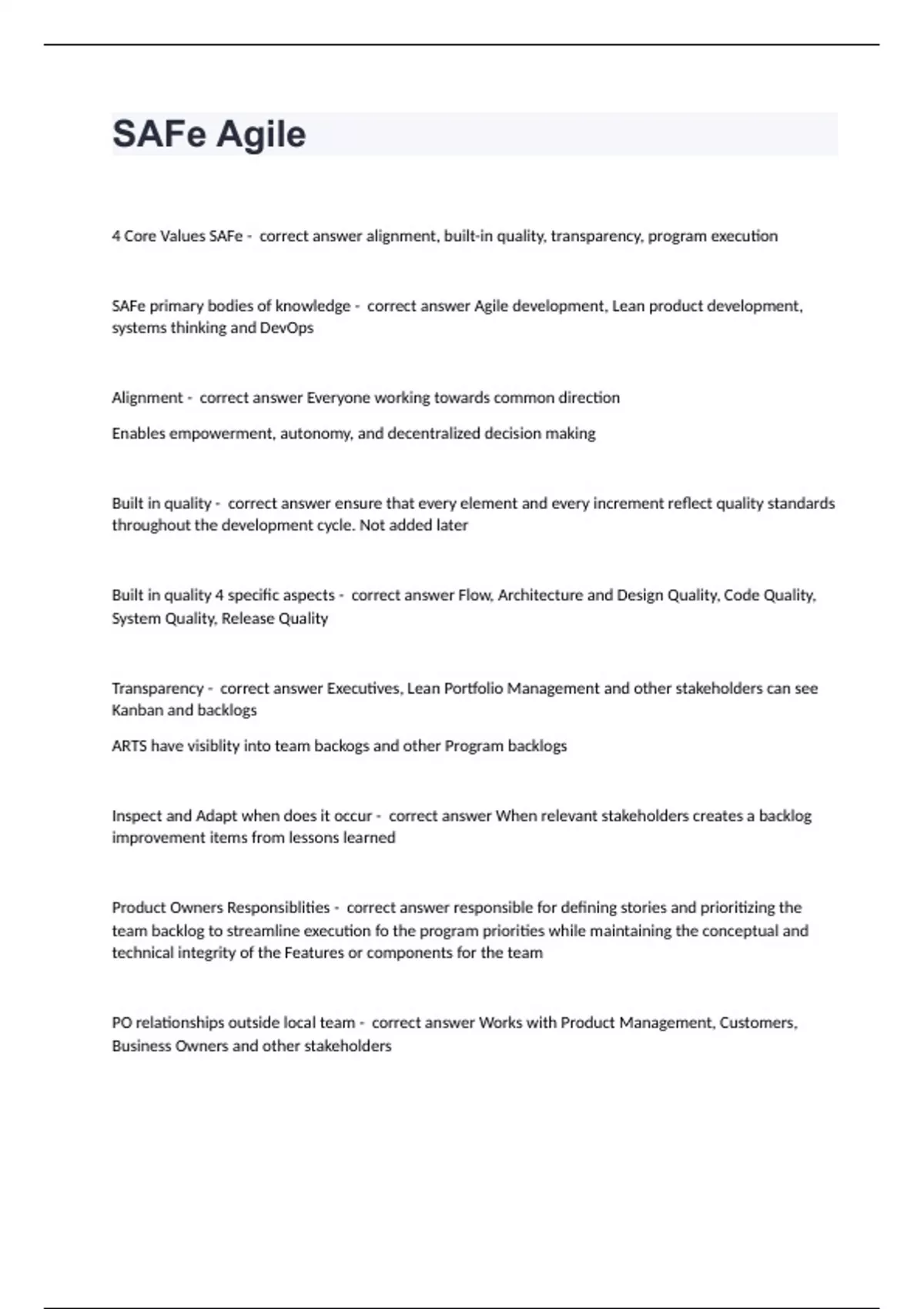 SAFe Agile4 Core Values SAFe - correct answer alignment, built-in quality, transparency, program execution SAFe primary bodies of knowledge - correct answer Agile development, Lean product development, systems thinking and DevOps Alignment - correct answer Everyone working towards common direction Enables empowerment, autonomy, and decentralized decision making Built in quality - correct answer ensure that every element and every increment reflect quality standards throughout the development cycle. Not added later Built in quality 4 specific aspects - correct answer Flow, Architecture and Design Quality, Code Quality, System Quality, Release Quality Transparency - correct answer Executives, Lean Portfolio Management and other stakeholders can see Kanban and backlogs ARTS have visiblity into team backogs and other Program backlogs Inspect and Adapt when does it occur - correct answer When relevant stakeholders creates a backlog improvement items from lessons learned Product Owners Responsiblities - correct answer responsible for defining stories and prioritizing the team backlog to streamline execution fo the program priorities while maintaining the conceptual and technical integrity of the Features or components for the team PO relationships outside local team - correct answer Works with Product Management, Customers, Business Owners and other stakeholders