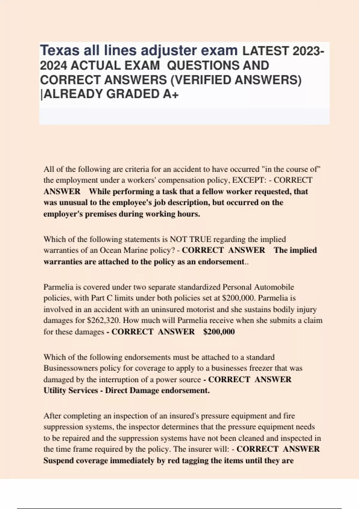 Texas all lines adjuster exam LATEST ACTUAL EXAM QUESTIONS AND CORRECT ANSWERS (VERIFIED ANSWERS) |ALREADY GRADED A+