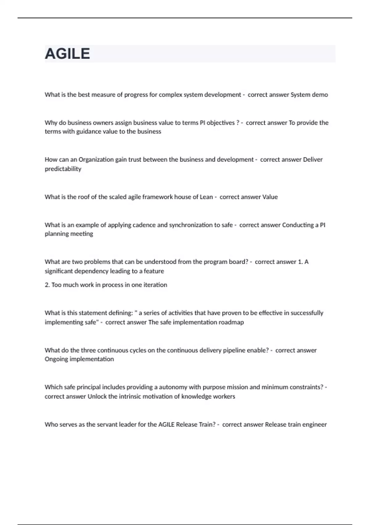 AGILE What is the best measure of progress for complex system development - correct answer System demo Why do business owners assign business value to terms PI objectives ? - correct answer To provide the terms with guidance value to the business How can an Organization gain trust between the business and development - correct answer Deliver predictability What is the roof of the scaled agile framework house of Lean - correct answer Value What is an example of applying cadence and synchronization to safe - correct answer Conducting a PI planning meeting What are two problems that can be understood from the program board? - correct answer 1. A significant dependency leading to a feature 2. Too much work in process in one iteration What is this statement defining: " a series of activities that have proven to be effective in successfully implementing safe" - correct answer The safe implementation roadmap What do the three continuous cycles on the continuous delivery pipeline enable? - correct answer Ongoing implementation Which safe principal includes providing a autonomy with purpose mission and minimum constraints? - correct answer Unlock the intrinsic motivation of knowledge workers Who serves as the servant leader for the AGILE Release Train? - correct answer Release train engineer