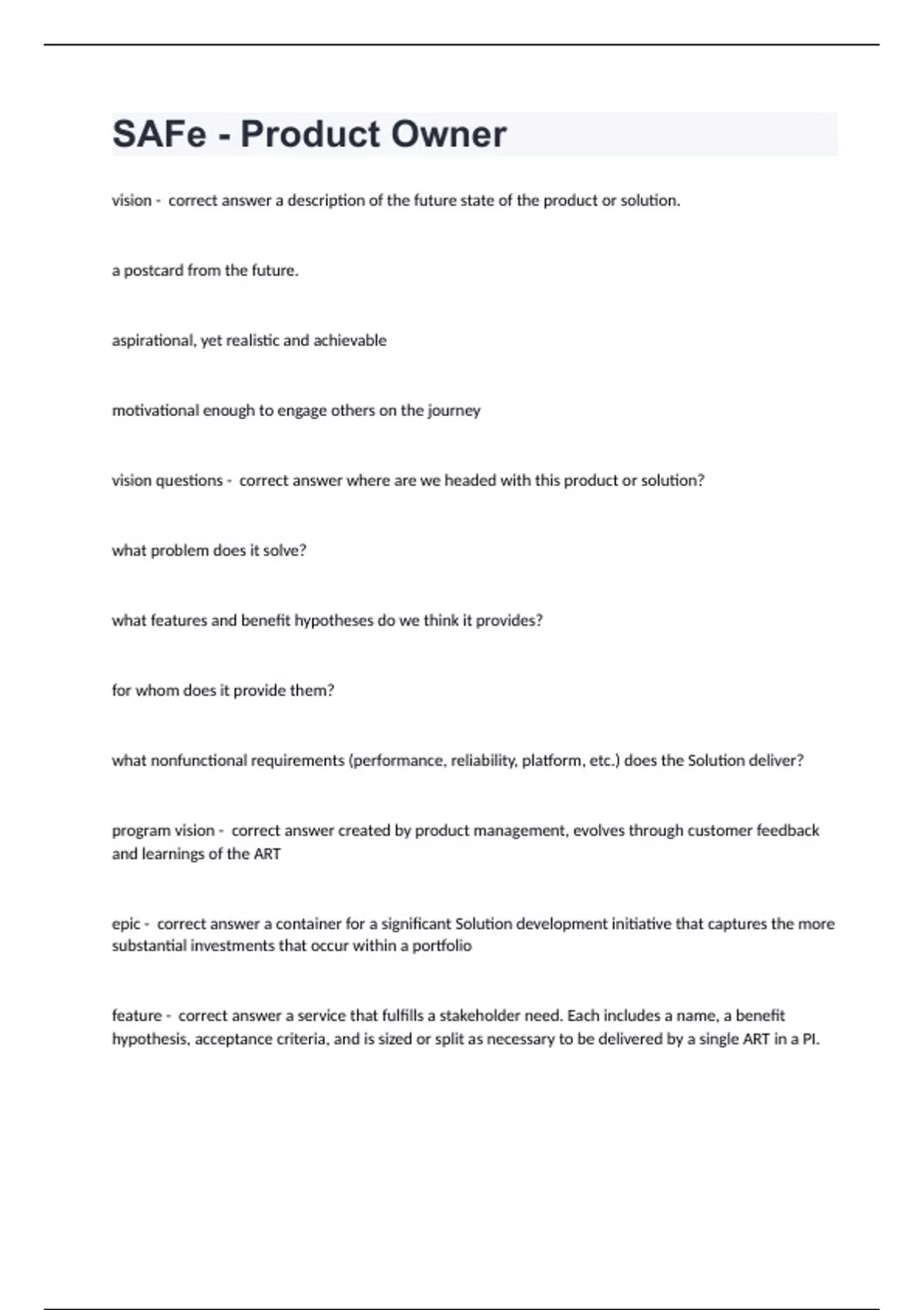 SAFe - Product Owner vision - correct answer a description of the future state of the product or solution. a postcard from the future. aspirational, yet realistic and achievable motivational enough to engage others on the journey vision questions - correct answer where are we headed with this product or solution? what problem does it solve? what features and benefit hypotheses do we think it provides? for whom does it provide them? what nonfunctional requirements (performance, reliability, platform, etc.) does the Solution deliver? program vision - correct answer created by product management, evolves through customer feedback and learnings of the ART epic - correct answer a container for a significant Solution development initiative that captures the more substantial investments that occur within a portfolio feature - correct answer a service that fulfills a stakeholder need. Each includes a name, a benefit hypothesis, acceptance criteria, and is sized or split as necessary to be delivered by a single ART in a PI.