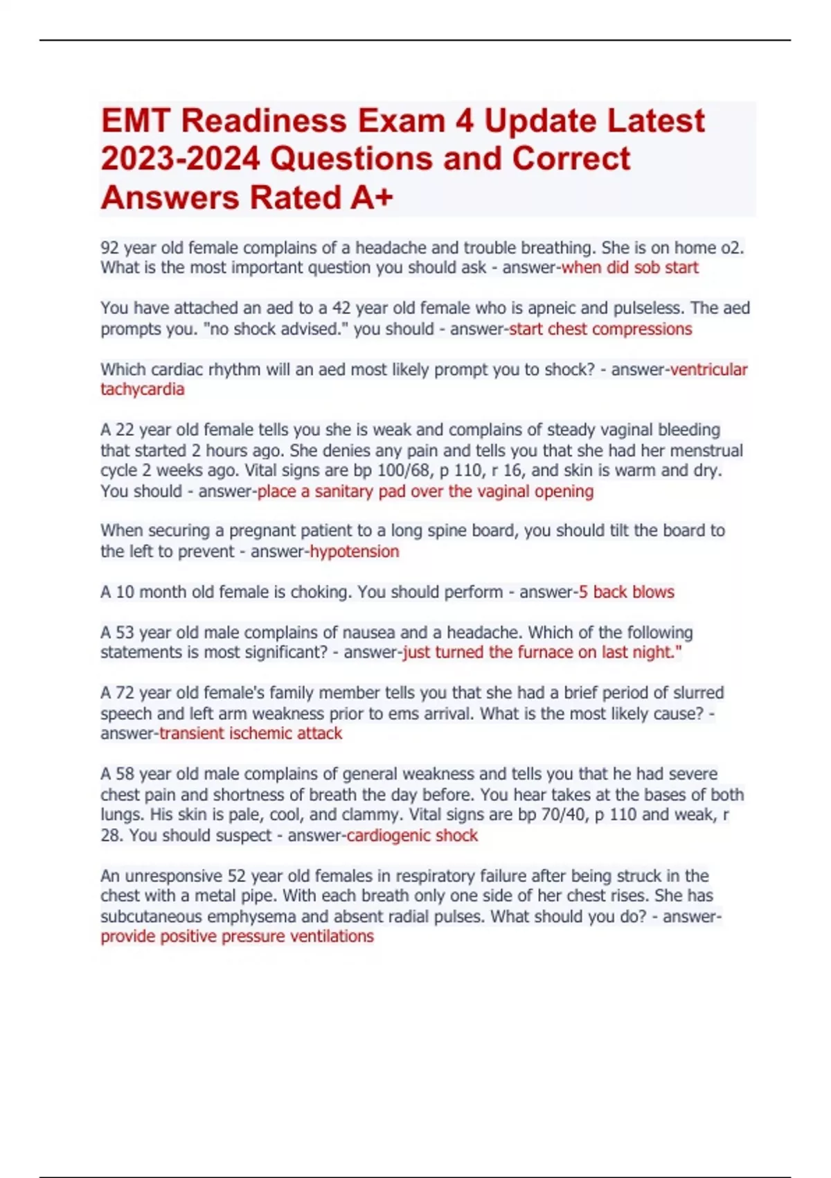 EMT Readiness Exam 4 Update Latest Questions and Correct Answers Rated A+