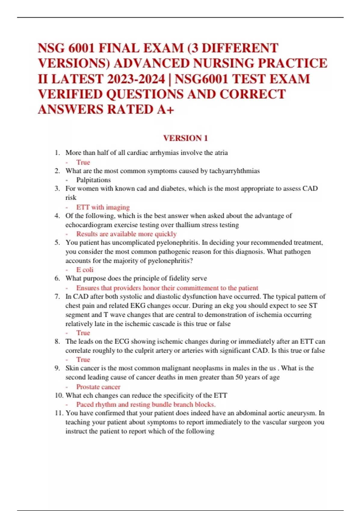 NSG 6001 FINAL EXAM (3 DIFFERENT VERSIONS) ADVANCED NURSING PRACTICE II LATEST | NSG6001 TEST EXAM VERIFIED QUESTIONS AND CORRECT ANSWERS RATED A+