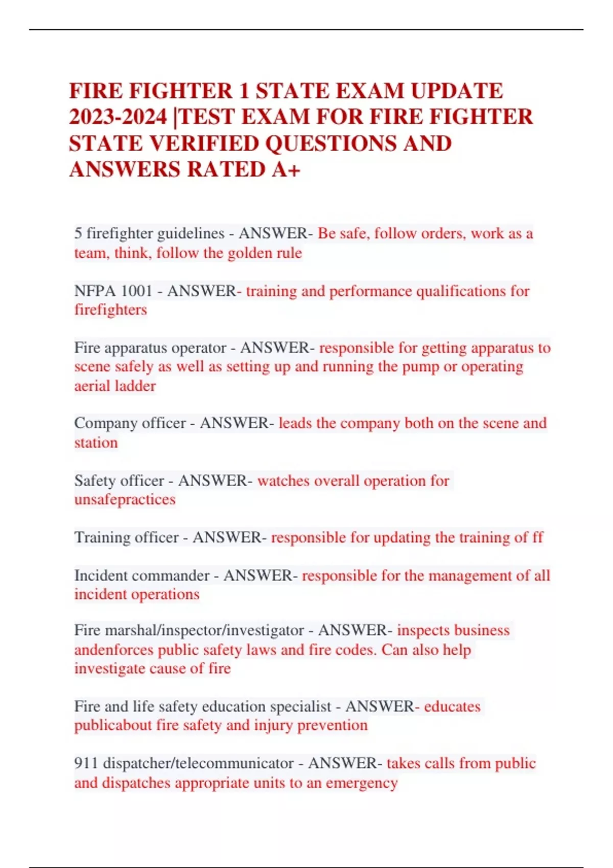 FIRE FIGHTER 1 STATE EXAM UPDATE |TEST EXAM FOR FIRE FIGHTER STATE VERIFIED QUESTIONS AND ANSWERS RATED A+