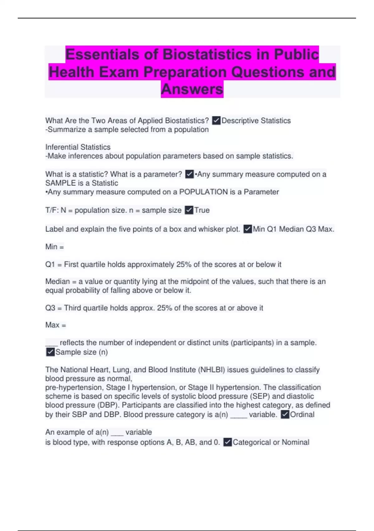 What Are the Two Areas of Applied Biostatistics? Descriptive Statistics -Summarize a sample selected from a population Inferential Statistics -Make inferences about population parameters based on sample statistics. What is a statistic? What is a parameter? •Any summary measure computed on a SAMPLE is a Statistic •Any summary measure computed on a POPULATION is a Parameter T/F: N = population size. n = sample size True Label and explain the five points of a box and whisker plot. Min Q1 Median Q3 Max. Min = Q1 = First quartile holds approximately 25% of the scores at or below it Median = a value or quantity lying at the midpoint of the values, such that there is an equal probability of falling above or below it.