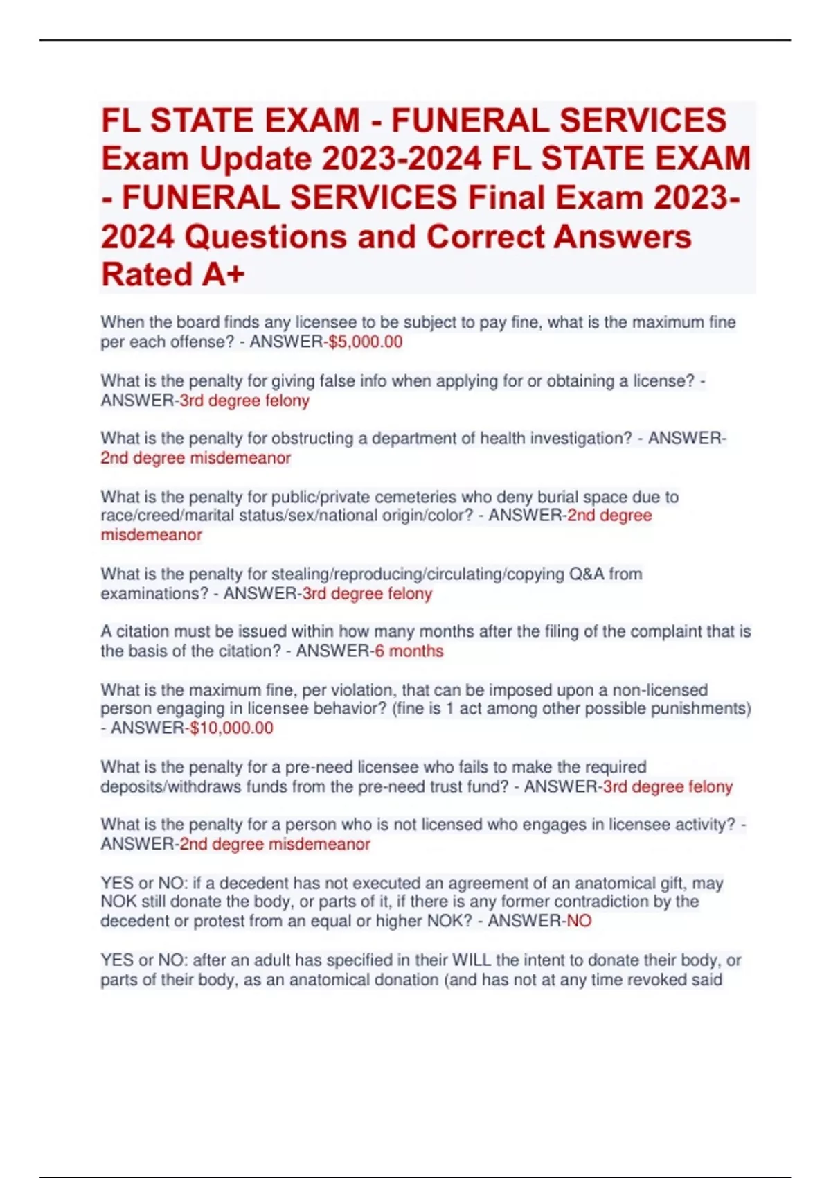FL STATE EXAM - FUNERAL SERVICES Exam Update FL STATE EXAM - FUNERAL SERVICES Final Exam Questions and Correct Answers Rated A+