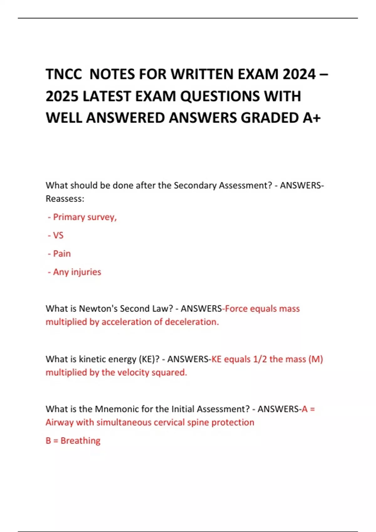TNCC NOTES FOR WRITTEN EXAM 2024 – 2025 LATEST EXAM QUESTIONS WITH WELL ANSWERED ANSWERS GRADED A+