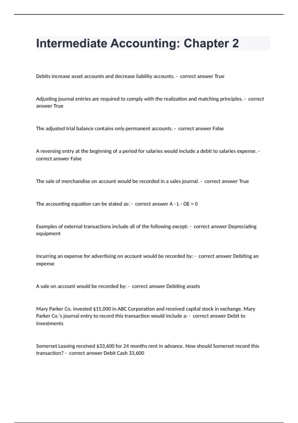 Intermediate Accounting: Chapter 2Debits increase asset accounts and decrease liability accounts. - correct answer True Adjusting journal entries are required to comply with the realization and matching principles. - correct answer True The adjusted trial balance contains only permanent accounts. - correct answer False A reversing entry at the beginning of a period for salaries would include a debit to salaries expense. - correct answer False The sale of merchandise on account would be recorded in a sales journal. - correct answer True The accounting equation can be stated as: - correct answer A - L - OE = 0 Examples of external transactions include all of the following except: - correct answer Depreciating equipment Incurring an expense for advertising on account would be recorded by: - correct answer Debiting an expense A sale on account would be recorded by: - correct answer Debiting assets Mary Parker Co. invested $15,000 in ABC Corporation and received capital stock in exchange. Mary Parker Co.'s journal entry to record this transaction would include a: - correct answer Debit to investments Somerset Leasing received $33,600 for 24 months rent in advance. How should Somerset record this transaction? - correct answer Debit Cash 33,600 Credit Unearned revenue 33,600