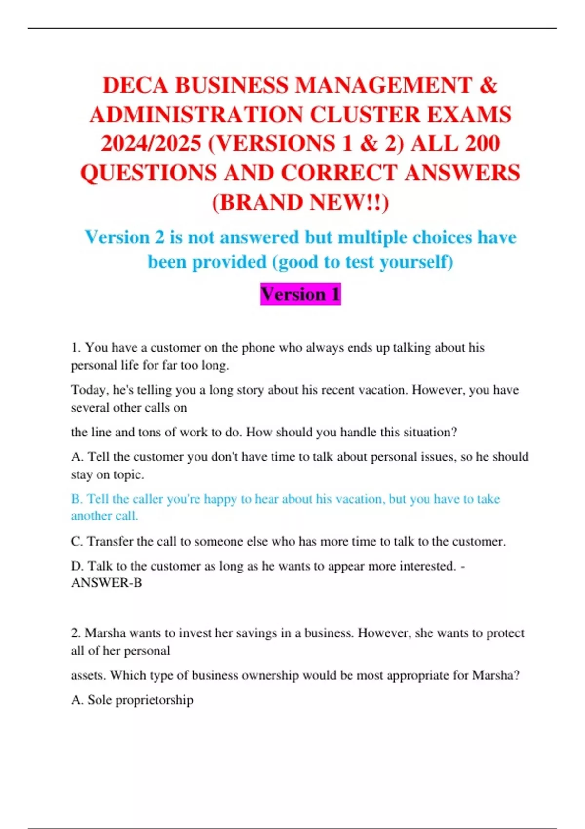 DECA BUSINESS MANAGEMENT & ADMINISTRATION CLUSTER EXAMS 2024/2025 (VERSIONS 1 & 2) ALL 200 QUESTIONS AND CORRECT ANSWERS (BRAND NEW!!) 1. You have a customer on the phone who always ends up talking about his personal life for far too long. Today, he's telling you a long story about his recent vacation. However, you have several other calls on the line and tons of work to do. How should you handle this situation? A. Tell the customer you don't have time to talk about personal issues, so he should stay on topic. B. Tell the caller you're happy to hear about his vacation, but you have to take another call. C. Transfer the call to someone else who has more time to talk to the customer. D. Talk to the customer as long as he wants to appear more interested. - ANSWER-B 2. Marsha wants to invest her savings in a business. However, she wants to protect all of her personal assets. Which type of business ownership would be most appropriate for Marsha? A. Sole proprietorship