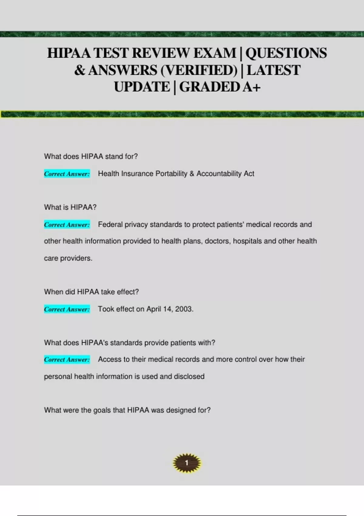 HIPAA TEST REVIEW EXAM | QUESTIONS & ANSWERS (VERIFIED) | LATEST UPDATE | GRADED A+HIPAA TEST REVIEW EXAM | QUESTIONS & ANSWERS (VERIFIED) | LATEST UPDATE | GRADED A+