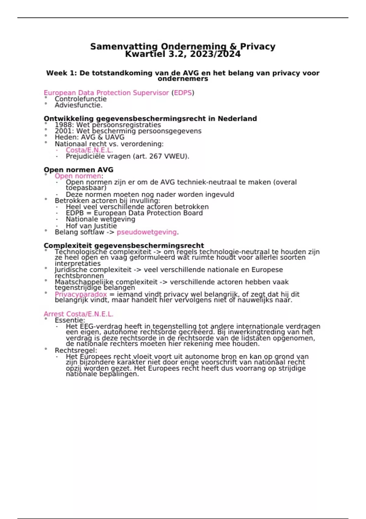 Samenvatting voor het vak Onderneming & Privacy van kwartiel 3.2 of 3.4. De samenvatting bevat alle relevante informatie van de hoorcolleges en de werkcolleges en alle relevante jurisprudentie. Eigen cijfer is een 7!
