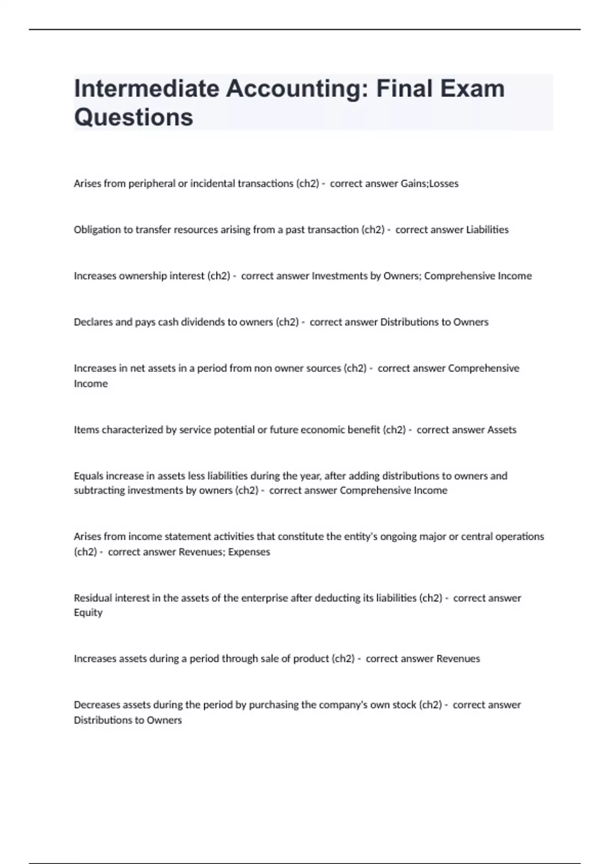 Intermediate Accounting: Final Exam Questions Arises from peripheral or incidental transactions (ch2) - correct answer Gains;Losses Obligation to transfer resources arising from a past transaction (ch2) - correct answer Liabilities Increases ownership interest (ch2) - correct answer Investments by Owners; Comprehensive Income Declares and pays cash dividends to owners (ch2) - correct answer Distributions to Owners Increases in net assets in a period from non owner sources (ch2) - correct answer Comprehensive Income Items characterized by service potential or future economic benefit (ch2) - correct answer Assets Equals increase in assets less liabilities during the year, after adding distributions to owners and subtracting investments by owners (ch2) - correct answer Comprehensive Income Arises from income statement activities that constitute the entity's ongoing major or central operations (ch2) - correct answer Revenues; Expenses Residual interest in the assets of the enterprise after deducting its liabilities (ch2) - correct answer Equity Increases assets during a period through sale of product (ch2) - correct answer Revenues Decreases assets during the period by purchasing the company's own stock (ch2) - correct answer Distributions to Owners
