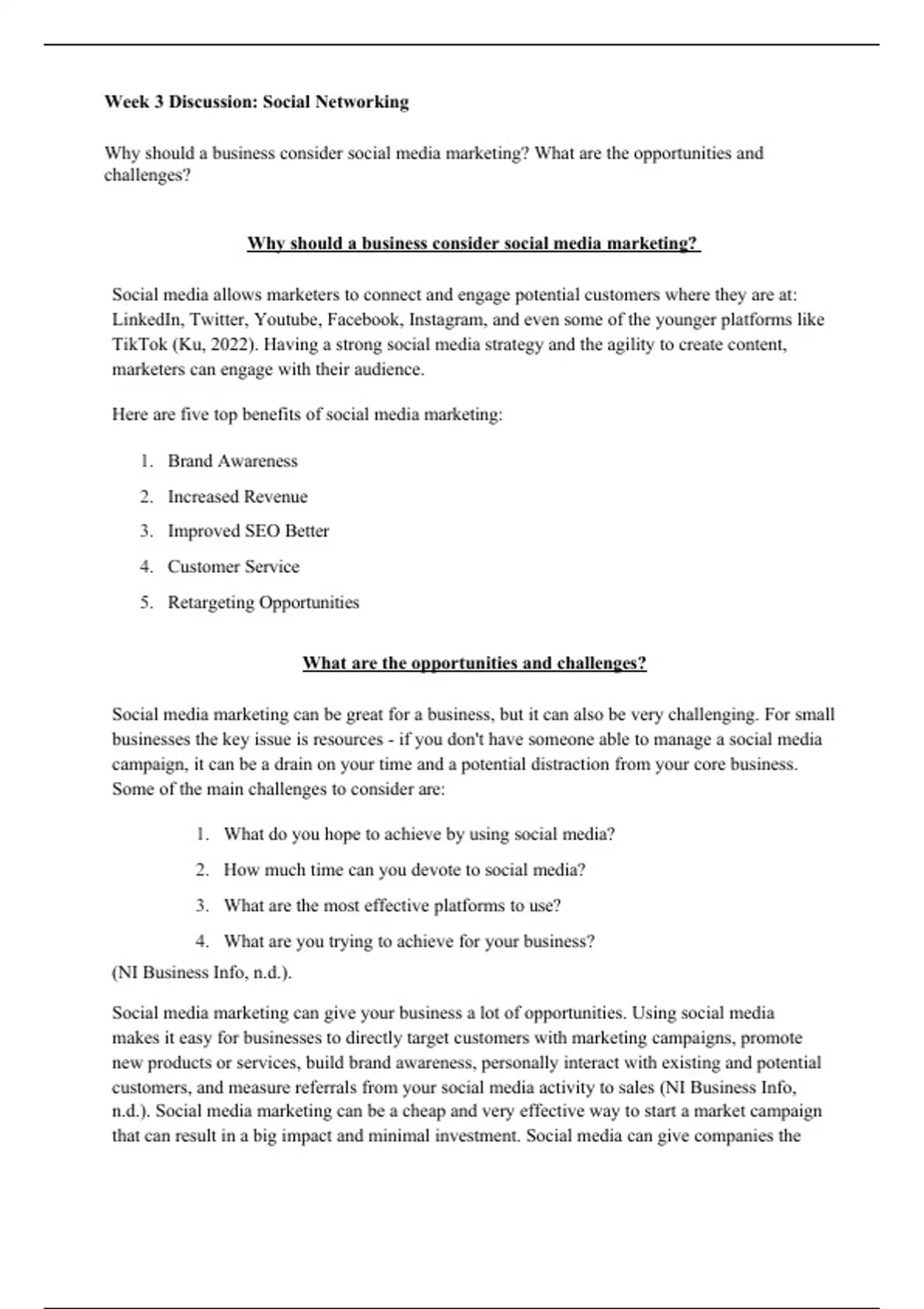 Week 3 Discussion: Social Networking Why should a business consider social media marketing? What are the opportunities and challenges? Why should a business consider social media marketing?
