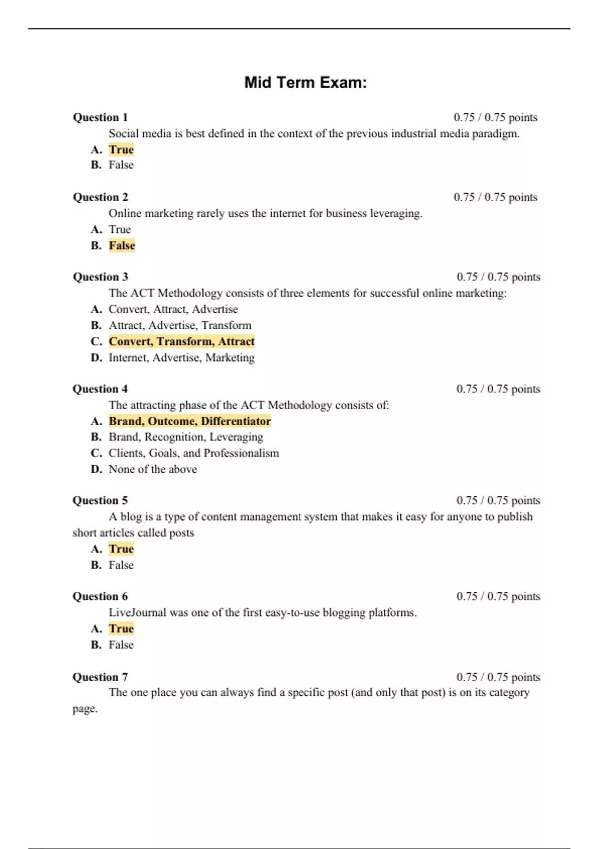 1. Question: Social media is best defined in the context of the previous industrial media paradigm. 2. Question: Online marketing rarely uses the internet for business leveraging. 3. Question: The ACT Methodology consists of three elements for successful online marketing: 4. Question: The attracting phase of the ACT Methodology consists of: 5. Question: A blog is a type of content management system that makes it easy for anyone to publish short articles called posts 6. Question: LiveJournal was one of the first easy-to-use blogging platforms. 7. Question: The one place you can always find a specific post (and only that post) is on its category page. 8. Question: Category pages are a feature that is included in most blogging software. 9. Question: Studies show that when people sample a product, they are more likely to buy the product. The formula that best captures this strategy is: 10. Question: Your own website is considered the best conversion tool as a part of a the ACT Methodology. 11. Question: Tactics are the way to implement your strategy. Tactics include: 12. Question: Microblogging is a form of blogging that limits the size of each post. 13. Question: Numbers and underscores in your username typically lead to more followers. 14. Question: The most important action of a social network is the act of two people connecting. 15. Question: LinkedIn is a social networking site for business professionals. It is the least restrictive of the social network in terms of customization and integration. 16. Question: Five elements of a great website include: 17. Question: Marketing is promoting a product or a service to increase sales. 18. Question: Social Media includes online platforms where people connect and communicate. 19. Question: Principles of social media marketing include respecting other people online. 20. Question: Facebook was the first social networking site to allow users to customize their profiles.