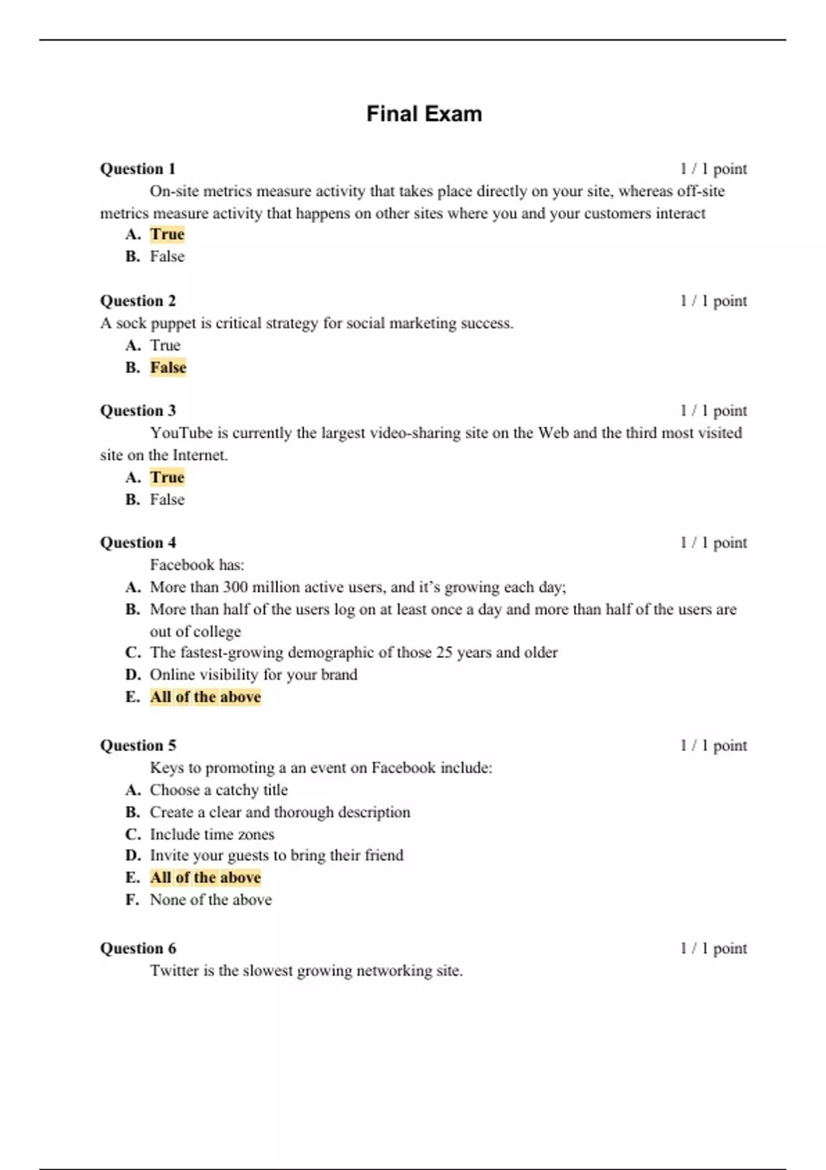1. Question: On-site metrics measure activity that takes place directly on your site, whereas off-site metrics measure activity that happens on other sites where you and your customers interact 2. Question: A sock puppet is critical strategy for social marketing success. 3. Question: YouTube is currently the largest video-sharing site on the Web and the third most visited site on the Internet. 4. Question: Facebook has: 5. Question: Keys to promoting a an event on Facebook include: 6. Question: Twitter is the slowest growing networking site. 7. Question: Twitter requires a little investment and can quickly prove worthwhile in increased buzz, sales, and consumer insight. 8. Question: Any tweet containing your username will be shown on your Replies page. 9. Question: A social network is a website where people connect with friends and is not intended to market businesses. 10. Question: LinkedIn is a network geared toward professionals looking to network. 11. Question: The Do’s of LinkedIn include: 12. Question: Your Facebook page cannot be connected to your Twitter account to pull in your tweets. 13. Question: Bounce rates are a great way to identify which pages or sources of traffic are not working for you. 14. Question: Measuring hits or page views does not provide useful information. 15. Question: Key components that are not part of a social media policy include: 16. Question: Traditional marketing holds characteristics: 17. Question: Online marketing/Social Media Marketing holds characteristics: 18. Question: All websites are blogs 19. Question: Social media platforms are a great way to showcase past and present success stories. 20. Question: Yelp is the largest local review directory on the Web.
