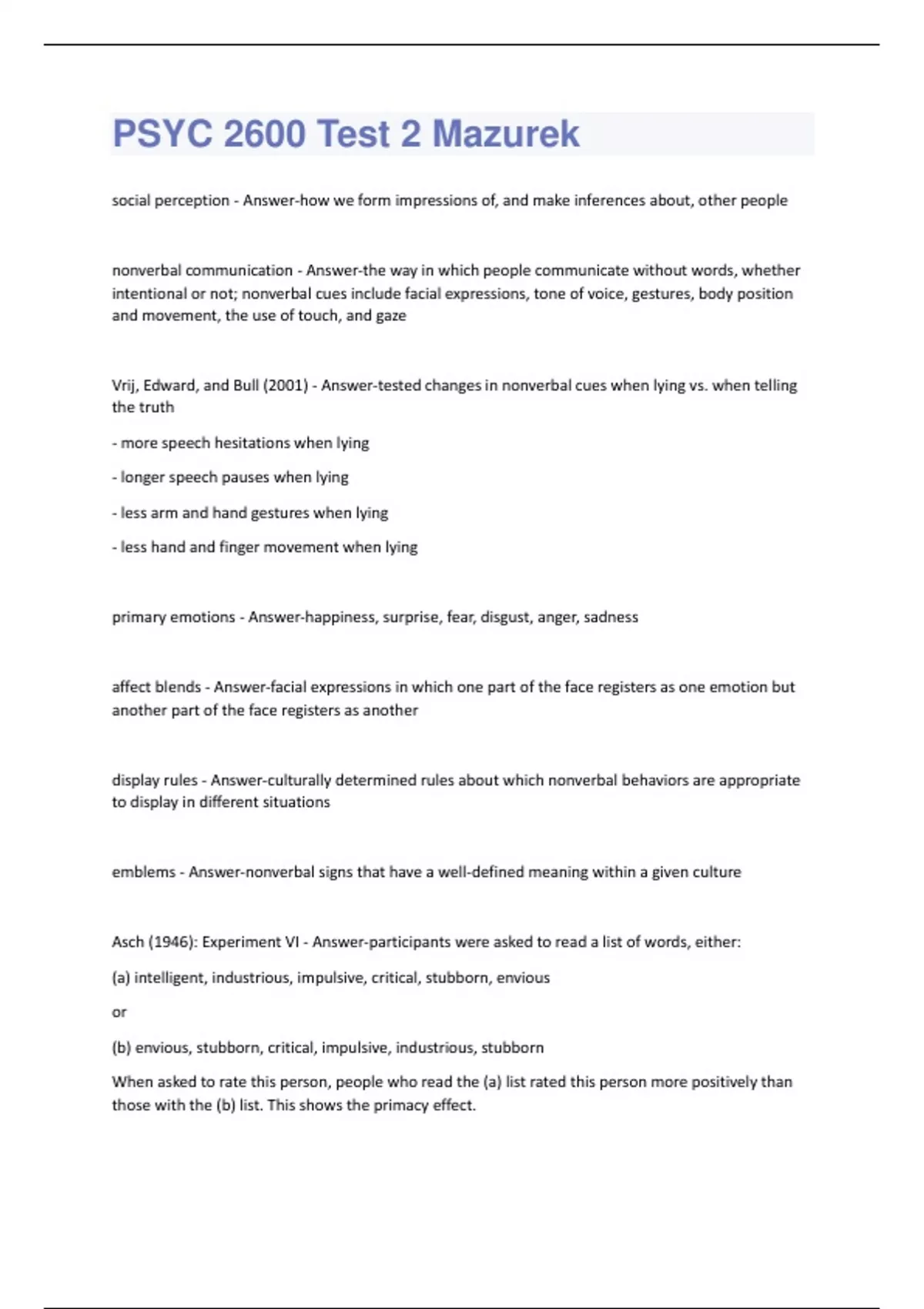 PSYC 2600 Test 2 Mazurek (Questions + Answers) Solved