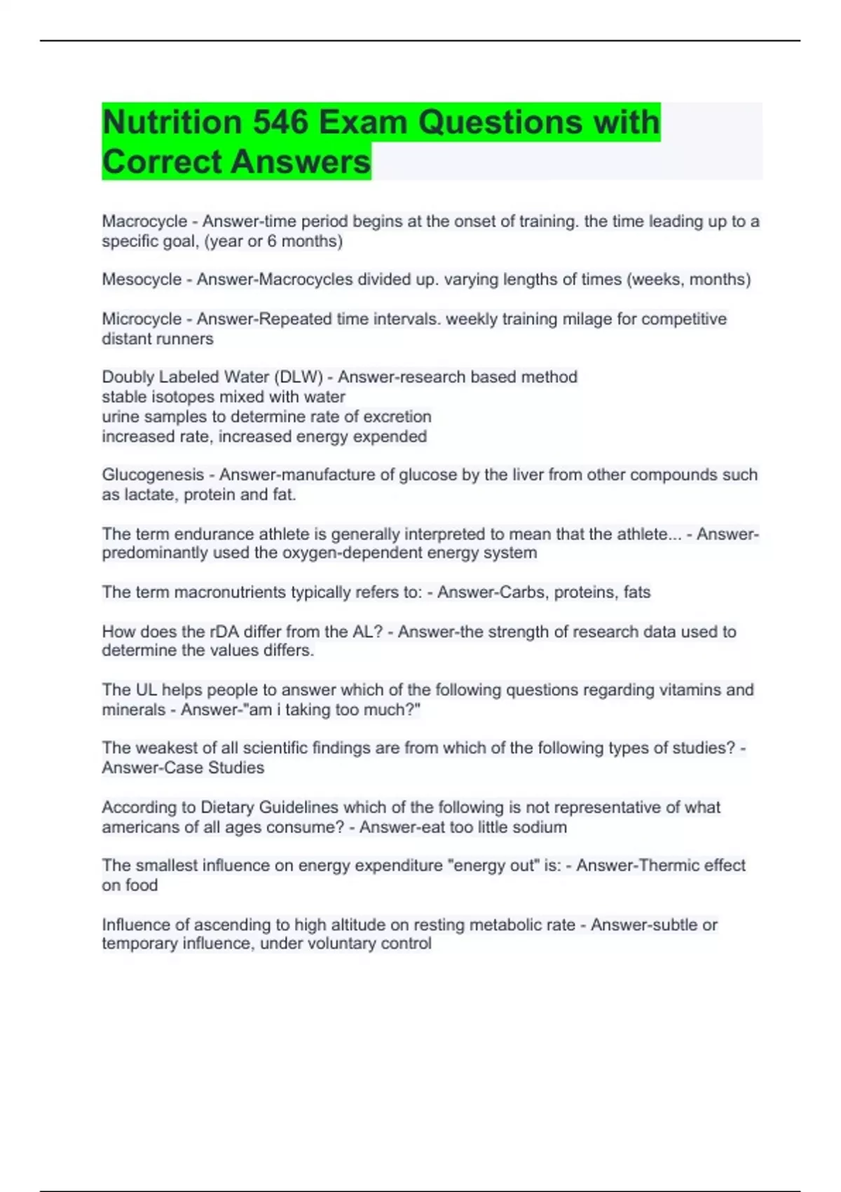 Nutrition 546 Exam Questions with Correct Answers Which of the following equations is used to predict resting metabolic rate best accounts for the higher than normal amount of muscle mass in trained athletes? - Answer-Cunningham The most practical effective and healthful way to increase metabolic rate is to - Answer-Exercise more often What is nutrient density? - Answer-a food possesses a significant amount of specific nutrients per serving relative to its caloric content The current USDA Myplate guide is based on the following food groups - Answer-grains, veggies, fruits, protein, dairy What is the effect on muscle ATP and Creatine phosphate when an athlete preforms very high intensity exercise for a very short period of time? - Answer-ATP declines then plateaus while creatine declines substantially. If Creatine phosphate is nearly depleted in skeletal muscle by high intensity exercise, how it it rephosphorylated? - Answer-from ATP generated aerobically by oxidative phosphorylation. The duration of the anaerobic glycolysis is energy system is approximately - Answer-1-2 minutes Which of the following is true about lactate - Answer-its metabolized back into pyruvate via aerobic metabolism Most important carriers for electrons in oxidation-reduction are: - Answer-NAD and FAD ATP production fastest to slowest - Answer-Creatine Phosphate, Anaerobic glycolysis, Oxidative phosphorylation (carbs), oxidative phosphorylation (fat) Least to greatest based on total capacity for ATP production - Answer-Creatine Phosphate, Anaerobic glycolysis, oxidative phosphorylation (carbs), oxidative phosphorylation (fat) Energy systems named in order from least to greatest based on endurance capacity - Answer-Creatine Phosphate, Anaerobic glycolysis, oxidative phosphorylation (carbs), (fat) The respiratory exchange ratio (RER) is a way of determining the boys metabolism of_______. - Answer-carbohydrates and fat Which of the following is NOT true of Nutrient in the post-absorptive state? - Answer-liver glycogen is broken down to maintain blood glucose concentration