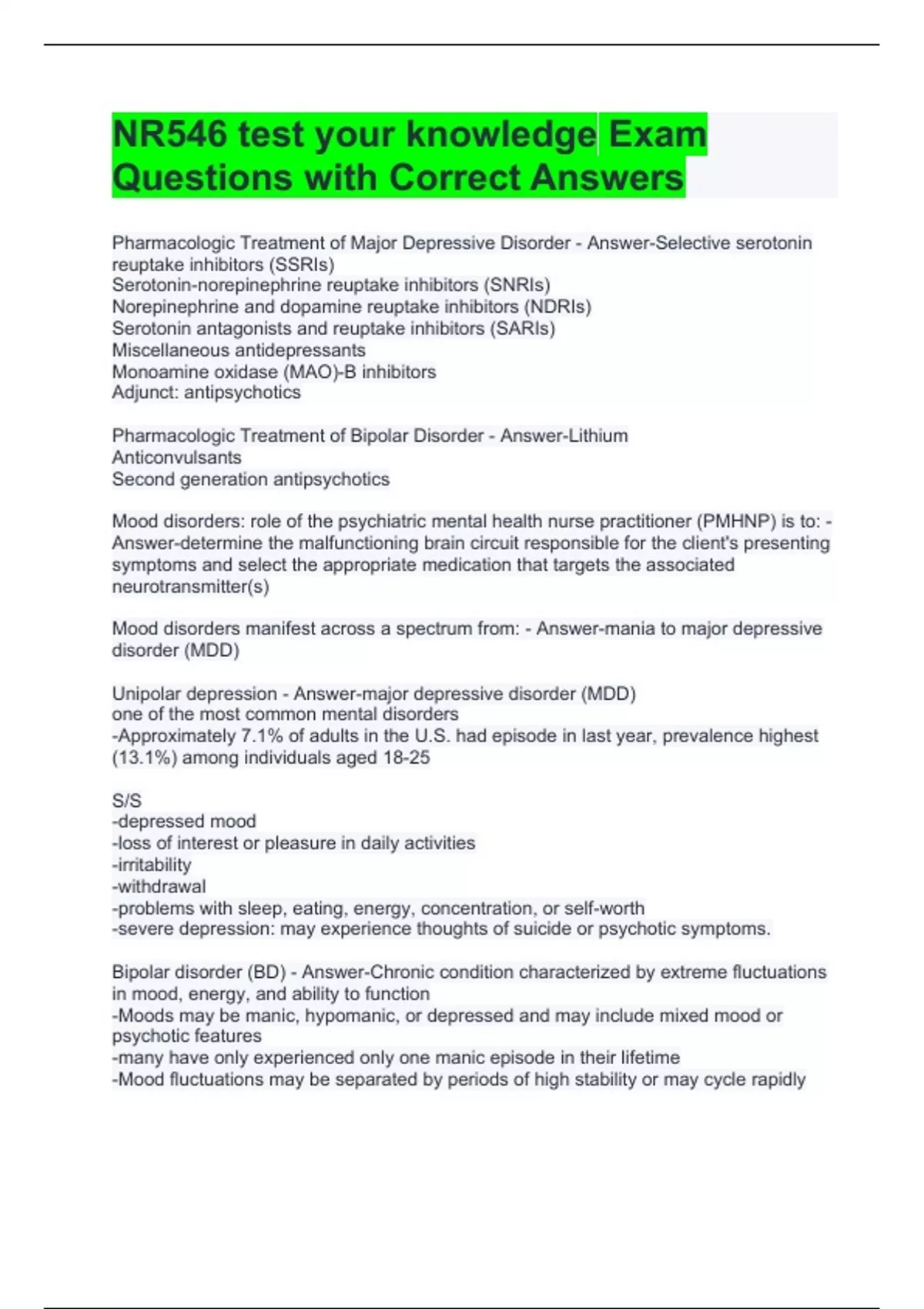 NR546 test your knowledge Exam Questions with Correct Answers mania - Answer-characterized by a persistently elevated, expansive, or irritable mood. Related symptoms may include inflated self-esteem, increased goal-directed activity or energy, including grandiosity, decreased need for sleep, excessive talkativeness, racing thoughts, flight of ideas (FOI), distractibility, psychomotor agitation, and a propensity to be involved in high-risk activities. Mania leads to significant functional impairment and may include psychotic features or necessitate hospitalization Bipolar Type I: - Answer-requires at least one episode of mania for at least one week (or any duration if hospitalization due to symptoms is required) Bipolar Type II: - Answer-diagnosis requires a current or past hypomanic episode and a current or past major depressive episode. Symptoms last for at least 4 days but fewer than seven. -Hypomanic symptoms are not of sufficient duration or severity to cause significant functional impairment, psychosis, or hospitalization. -Anger and irritability are common. -Clients often enjoy the elevation of mood and are reluctant to report these symptoms, making bipolar more difficult to diagnose if the client presents in the depression phase. Cyclothymia: - Answer-involves the chronic presentation of hypomanic and depressive symptoms that do not meet the diagnostic criteria for a major depressive or manic/hypomanic episode. If bipolar depression is mistaken for MDD: - Answer-antidepressant therapy may precipitate a manic episode or induce rapid-cycling bipolar depression -may contribute to the increased incidence of death by suicide in children and adults younger than 25 Antidepressants are used cautiously in clients with bipolar disorder and never as ________________. - Answer-monotherapy -Antidepressants should be combined with a mood stabilizer to prevent the onset of a hypomanic or manic episode DA, NE Dysfunction causes what mood related symptoms - Answer-Decreased positive affect: depressed mood loss of joy lack of interest loss of energy decreased alertness decreased self-confidence appetite changes