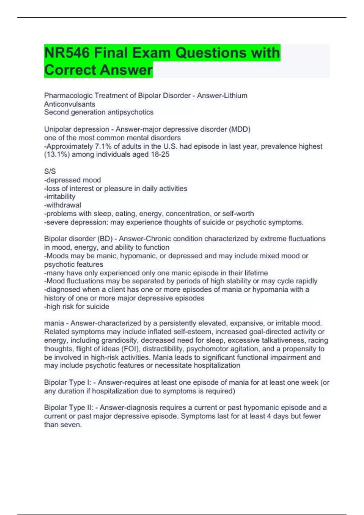 NR546 Final Exam Questions with Correct Answer -Hypomanic symptoms are not of sufficient duration or severity to cause significant functional impairment, psychosis, or hospitalization. -Anger and irritability are common. -Clients often enjoy the elevation of mood and are reluctant to report these symptoms, making bipolar more difficult to diagnose if the client presents in the depression phase. Cyclothymia: - Answer-involves the chronic presentation of hypomanic and depressive symptoms that do not meet the diagnostic criteria for a major depressive or manic/hypomanic episode. If bipolar depression is mistaken for MDD: - Answer-antidepressant therapy may precipitate a manic episode or induce rapid-cycling bipolar depression -may contribute to the increased incidence of death by suicide in children and adults younger than 25 Antidepressants are used cautiously in clients with bipolar disorder and never as ________________. - Answer-monotherapy -Antidepressants should be combined with a mood stabilizer to prevent the onset of a hypomanic or manic episode DA, NE Dysfunction causes what mood related symptoms - Answer-Decreased positive affect: depressed mood loss of joy lack of interest loss of energy decreased alertness decreased self-confidence appetite changes 5HT, NE Dysfunction causes what mood related symptoms - Answer-Increased negative affect: depressed mood guilt fear/anxiety hostility irritability loneliness appetite changes monoamine hypothesis of depression - Answer--depression occurs as a result of a deficiency of one or all three monoamine transmitters • serotonin, norepinephrine, and dopamine -while mania may result from an excess Medication Management for Depression, First-Line Treatment: - Answer-• Selective Serotonin Reuptake Inhibitors (SSRIs) • Serotonin Norepinephrine Reuptake Inhibitors (SNRIs) • Norepinephrine Dopamine Reuptake Inhibitors (NDRI) • Serotonin Antagonist and Reuptake Inhibitors (SARIs) SSRI's - Answer-Mechanism of action • inhibit 5-HT reuptake Adverse effects -diarrhea -headache -weight gain -sexual side effects SNRI's - Answer-Mechanism of action • inhibit 5-HT reuptake • inhibit NE reuptake (increase energy, focus) • increase DA in prefrontal cortex (increase cognition) Adverse effects -elevated blood pressure -anxiety -insomnia -constipation NDRI's - Answer-Mechanism of action • inhibit DA reuptake (increase alertness, motivation) • inhibit NE reuptake (increase energy) Adverse effects -agitation -headache -dry mouth -constipation -weight loss SSRI Prescribing Pearls: med with mild antihistamine effects - Answer-citalopram (Celexa) SSRI Prescribing Pearls: med with no known drug interactions - Answer-escitalopram (Lexapro) SSRI Prescribing Pearls: med with longest half-life - Answer-fluoxetine (Prozac) SSRI Prescribing Pearls: med that also treats social anxiety and insomnia - Answer-paroxetine (Paxil)