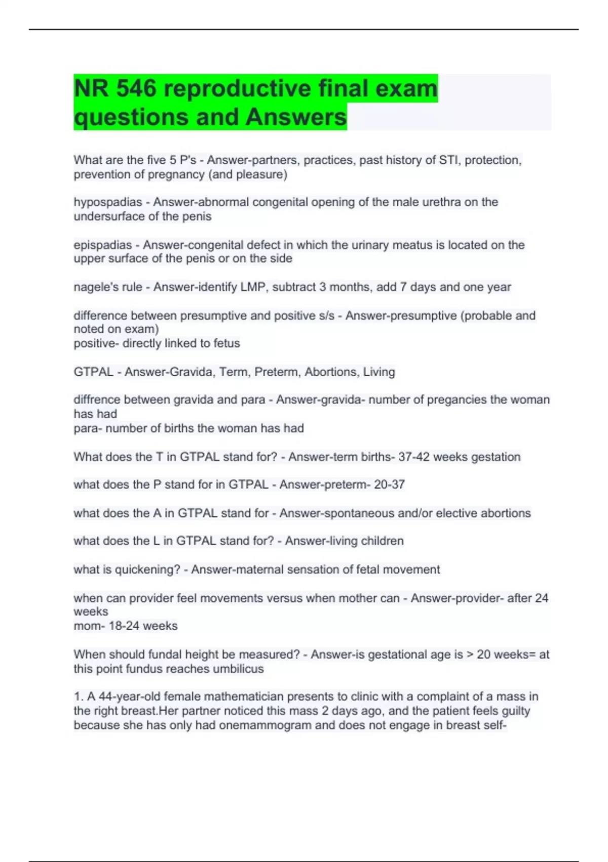 NR 546 reproductive final exam questions and Answers examination (BSE) on any regular basis. She has nofamily history of breast cancer, and her prior mammogram was ordered as a routine screening test atage 43 years after a brief discussion with her primary care provider. After a thorough investigationreveals a benign cyst, what advice should be given to this patient about screening for breast cancer inher age group? - Answer-This patient was in compliance with the U.S. Preventive Services Task Force (USPSTF)recommendations for her age group and risk factors prior to her current complaint A 42-year-old female website developer presents for an annual preventive examination withquestions about breast cancer screening. She is concerned about the radiation exposure associated withmammography and is interested in magnetic resonance imaging (MRI) as a possible alternative forroutine screening. She is otherwise healthy with no family history of breast, ovarian, or colon cancer.Which of the following is true about MRI as a screening modality for breast cancer in the generalpopulation? - Answer-Sensitivity of screening for breast cancer increases with breast MRI at the expense of specificity. A 35-year-old G0P0 woman presents to clinic with a complaint of bilateral nipple discharge. Thisdischarge started several weeks ago and has occurred at irregular intervals since that time. She does notcomplain of local tenderness, redness, fever, or any other systemic symptoms aside from slightlyirregular periods over the last few months. On examination, she is able to express a small amount ofdischarge, which is sent to the laboratory and found to be consistent with breast milk but without anysigns of blood or pus. Screening laboratories are also sent, which reveal a normal blood count, metabolicpanel, thyroid-stimulating hormone, and human chorionic gonadotropin (HCG) level. Furtherlaboratories are still pending. Which of the following is the most likely diagnosis? - Answer-Prolactinoma A 22-year-old G0P0 undergraduate student presents to clinic after finding a breast mass on breastself-examination (BSE) at home. The mass is nontender without skin changes, erythema, or overlyingswelling. She has heard that most breast cancers are found by patients themselves, and she is veryconcerned that she may have breast cancer. Which of the following is true about BSE and self-detectionof breast cancer - Answer-This patient is more likely to find a fibroadenoma than a cancer on self-examination A 48-year-old female psychologist presents to clinic with concerns about her breast cancer risk afteran age-matched cousin was recently diagnosed with this disease. This cousin is the third family memberon her father's side in as many years to be diagnosed with breast cancer, including the patient's ownfather, who had surgery and subsequent treatment 3 years ago for breast cancer. The patient has littleother knowledge of her family history, only that her grandparents independently arrived from EasternEurope near the end of World War II and were among very few members of their family that survivedthe war. The patient has read about testing for the breast cancer genes (BRCA1 and BRCA2) and desiresfurther information about whether this would be appropriate for her. Which of the following is trueabout this patient's indications for BRCA testing? - Answer-This patient carries several risk factors that together justify BRCA testing A 68-year-old former paleontologist presents to clinic with concerns about her breast cancer risk. Her mother developed the disease in her 50s and died from it in her 60s. A younger cousin developed the disease a few years ago before the age of 50 years, but this individual was not tested for the BRCA1 andBRCA2 genes. In addition, the patient suffered from lymphoma in her 20s and had radiation to the chest.She did take hormone replacement therapy for a few years before data emerged that this may contribute to breast cancer risk. She has had several abnormal mammograms in her 50s for persistently dense breasts with subtle findings, but follow-up biopsies never showed any malignant pathology.Which of the following is true regarding magnetic resonance imaging (MRI) screening of this patient - Answer-Regardless of recommendations, the high sensitivity of breast MRI comes at the expense of markedly decreased specificity (i.e., the ability to rule out disease in healthy breasts)