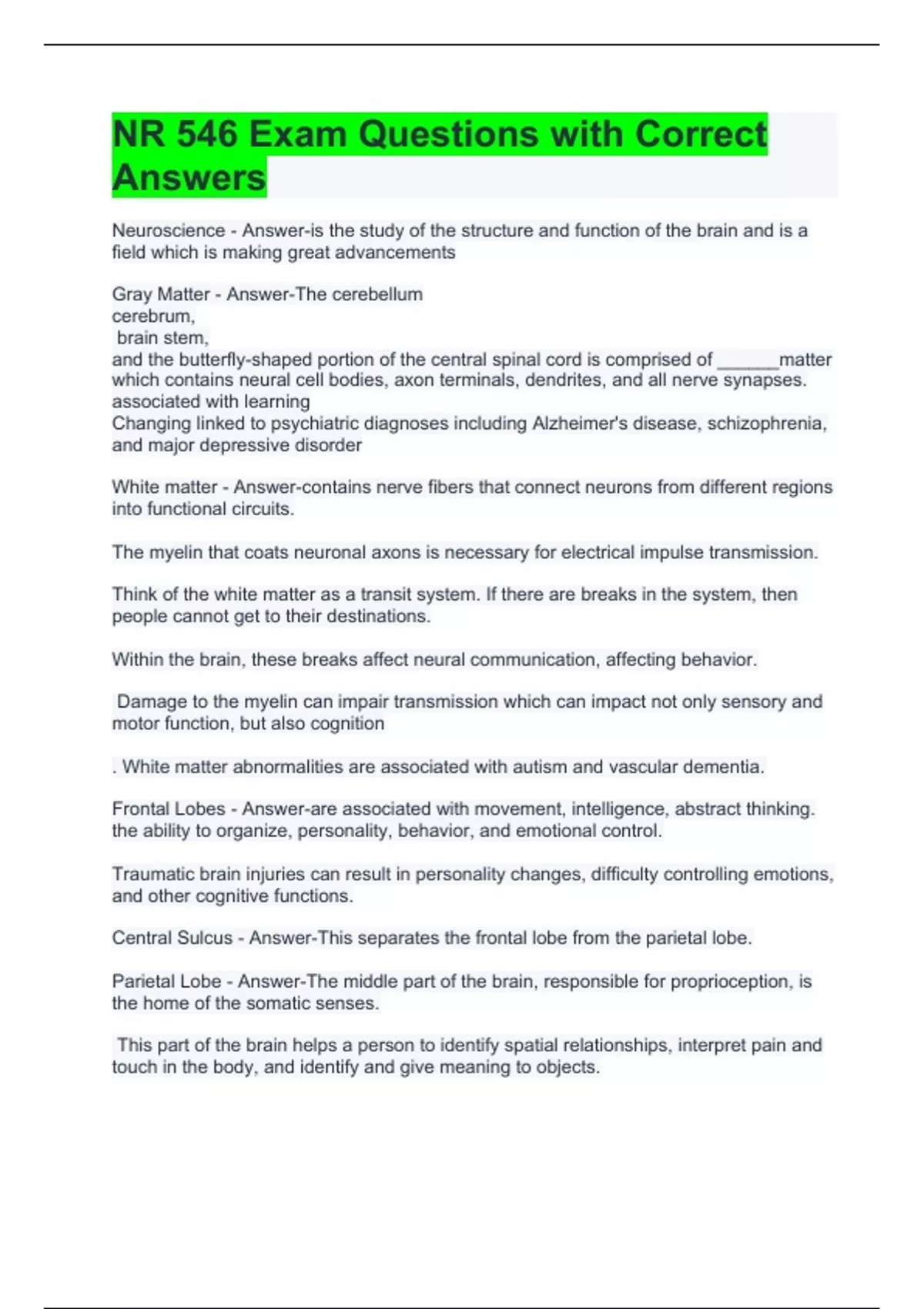 NR 546 Exam Questions with Correct Answers Damage to the anterior portion of the parietal lobe may cause asterogenesis, the loss of ability to recognize objects via the sense of touch. This may be experienced by patients with post cerebral vascular accidents Temporal Lobe - Answer-is located on the sides of the brain and involved in short-term memory, speech, auditory signals, and smell recognition. It identifies "what" things are - object identification. It contains the limbic system, amygdala, and hippocampus. There are multiple pathways within the temporal lobe which affect object identification and language comprehension, including the ability to understand semantics. A dominant temporal lobe lesion can present as Wernicke's aphasia. Temporal lobe disorders include dementia, affective disorders, and attention deficit hyperactivity disorders (ADHD). Occipital Lobe - Answer-This is the back part of the brain and controls visual processing. Damage to this lobe results in the inability to form visual memories. Bilateral lobe damage results in the inability to recognize items by sight even though vision is normal. Occipital lobe seizures can cause hallucinations, such as lines of color. Dorsal Striatum - Answer-This is involved in complex motor actions and linkage of cognition to motor actions. It is the main input area for the basal ganglia and is activated when anticipating or engaging in pleasure Basal Ganglia - Answer-A group of structures involved in voluntary motor movements, cognition, and emotion. Basal ganglia movement disorders include Parkinson's disease, obsessive-compulsive disorder (OCD), and Tourette syndrome. The striatum is a group of structures that includes the caudate, putamen, and nucleus accumbens. The dorsal striatum contains the caudate nucleus and the putamen. The ventral striatum contains the nucleus accumbens. Both are involved in facilitating voluntary movement
