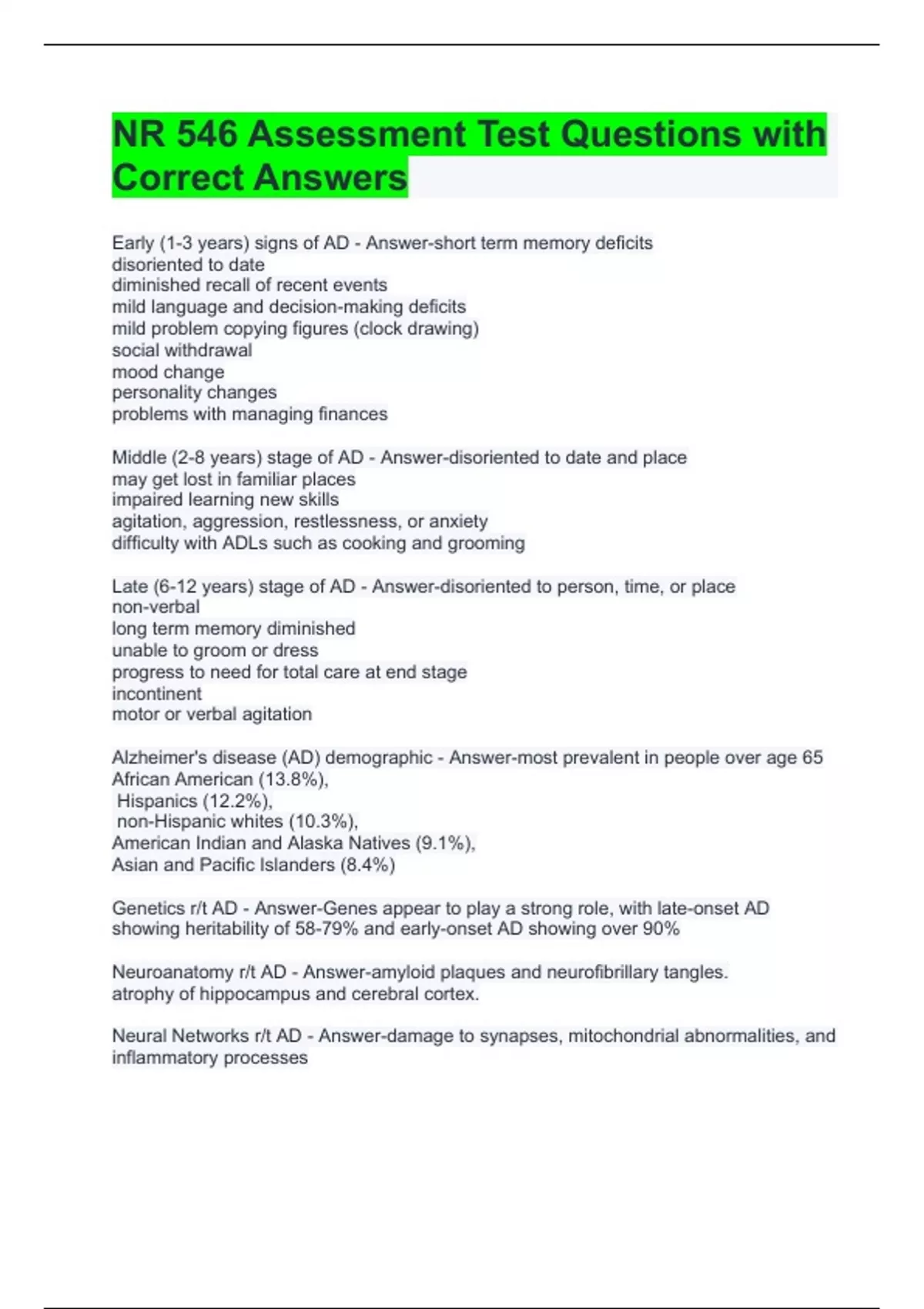 NR 546 Assessment Test Questions with Correct Answers Prescribing Pearls Rivastigmine (Exelon) - Answer-Prescribing Pearls Rivastigmine (Exelon) is administered orally or topically (transdermal patch). The transdermal patch is used for dementia associated with Parkinson's disease. Medications that induce or inhibit CYP450 metabolism will not modify rivastigmine (Exelon) metabolism galantamine (Razadyne, Razadyne ER) Mechanism of Action - Answer-Mechanism of Action Galantamine (Razadyne, Razadyne ER) acts by elevating acetylcholine (Ach) in the cerebral cortex, modulating the nicotinic Ach receptors to increase Ach release from existing presynaptic nerve terminals. It also increases glutamate and serotonin levels; however, the benefits of this action are unknown Common Side Effects galantamine (Razadyne, Razadyne ER) - Answer-Common Side Effects gastrointestinal symptoms (nausea, vomiting, diarrhea, anorexia, and weight loss) headache dizziness fatigue galantamine (Razadyne, Razadyne ER) Precautions - Answer-Precautions NSAID use GI bleed asthma or COPD concurrent use with medications that slow or decrease heart rate Contraindications galantamine (Razadyne, Razadyne ER) - Answer-Contraindications severe hepatic impairment severe renal impairment Prescribing Pearls galantamine (Razadyne, Razadyne ER) - Answer-Prescribing Pearls There are two major metabolizing enzymes CYP3A4 and CYP2D6 that increase galantamine (Razadyne, Razadyne ER) concentrations or reductions in clearance and anticholinergic side effects when given concurrently with inhibitors of these enzymes