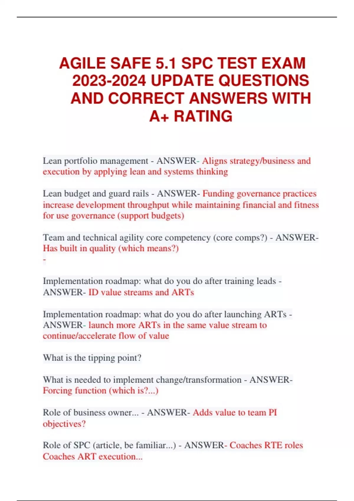 AGILE SAFE 5.1 SPC TEST EXAM LATEST UPDATE QUESTIONS AND CORRECT ANSWERS WITH A+ RATING