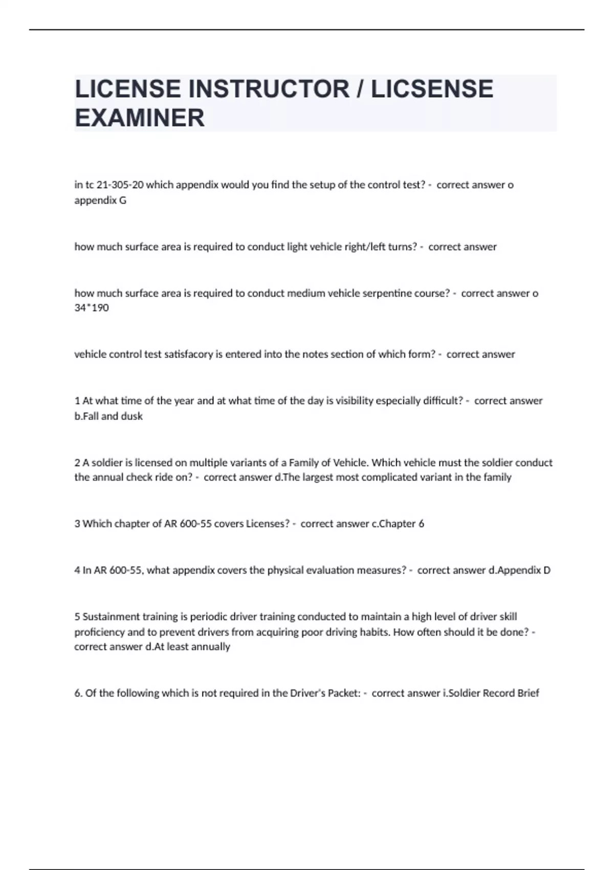 LICENSE INSTRUCTOR / LICSENSE EXAMINER in tc 21-305-20 which appendix would you find the setup of the control test? - correct answer o appendix G how much surface area is required to conduct light vehicle right/left turns? - correct answer how much surface area is required to conduct medium vehicle serpentine course? - correct answer o 34*190 vehicle control test satisfacory is entered into the notes section of which form? - correct answer 1 At what time of the year and at what time of the day is visibility especially difficult? - correct answer b.Fall and dusk 2 A soldier is licensed on multiple variants of a Family of Vehicle. Which vehicle must the soldier conduct the annual check ride on? - correct answer d.The largest most complicated variant in the family 3 Which chapter of AR 600-55 covers Licenses? - correct answer c.Chapter 6 4 In AR 600-55, what appendix covers the physical evaluation measures? - correct answer d.Appendix D 5 Sustainment training is periodic driver training conducted to maintain a high level of driver skill proficiency and to prevent drivers from acquiring poor driving habits. How often should it be done? - correct answer d.At least annually 6. Of the following which is not required in the Driver's Packet: - correct answer i.Soldier Record Brief